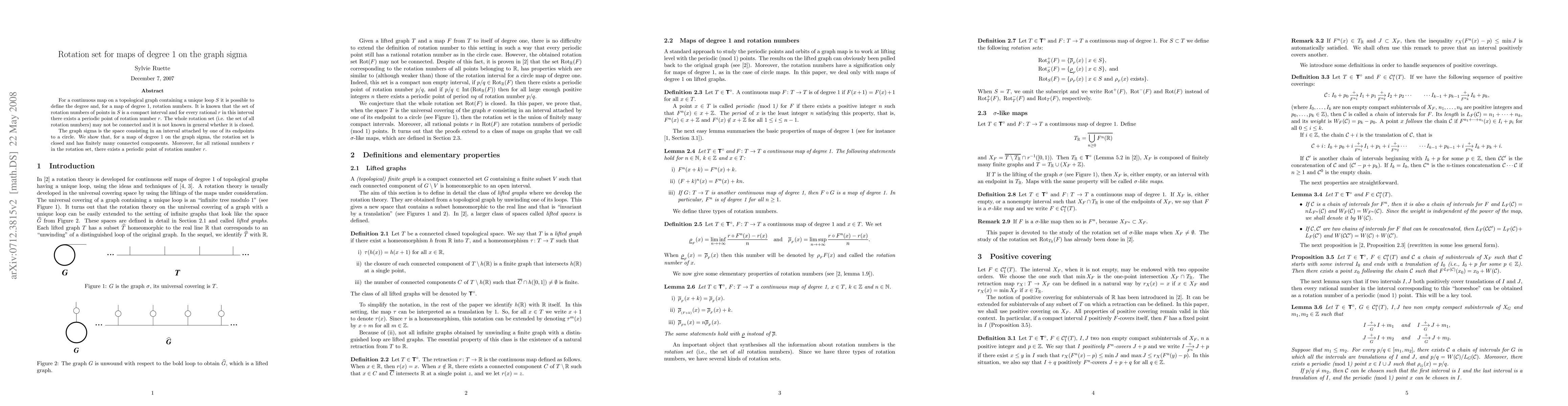 For a continuous map on a topological graph containing a unique loop S it is possible to define the degree and, for a map of degree 1, rotation numbers. It is known that the set of rotation numbers of points in S is a compact interval and for every rational r in this interval there exists a periodic point of rotation number r. The whole rotation set (i.e. the set of all rotation numbers) may not be connected and it is not known in general whether it is closed. The graph sigma is the space consisting in an interval attached by one of its endpoints to a circle. We show that, for a map of degree 1 on the graph sigma, the rotation set is closed and has finitely many connected components. Moreover, for all rational numbers r in the rotation set, there exists a periodic point of rotation number r.