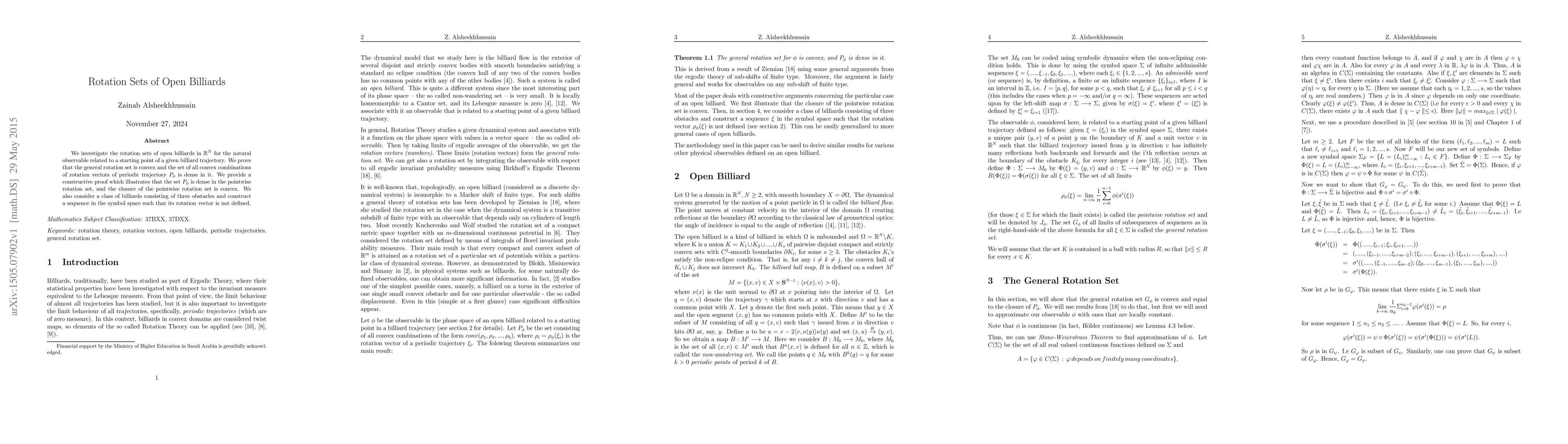 This paper explores the rotation sets of open billiards in $\mathbb{R}^N$, proving that the general rotation set is convex and that periodic trajectories' rotation vectors' convex combinations are dense within it. The study also demonstrates the density of periodic trajectories in the pointwise rotation set and the convexity of its closure. Additionally, it examines a specific three-obstacle billiard scenario where a sequence in the symbol space lacks a defined rotation vector.