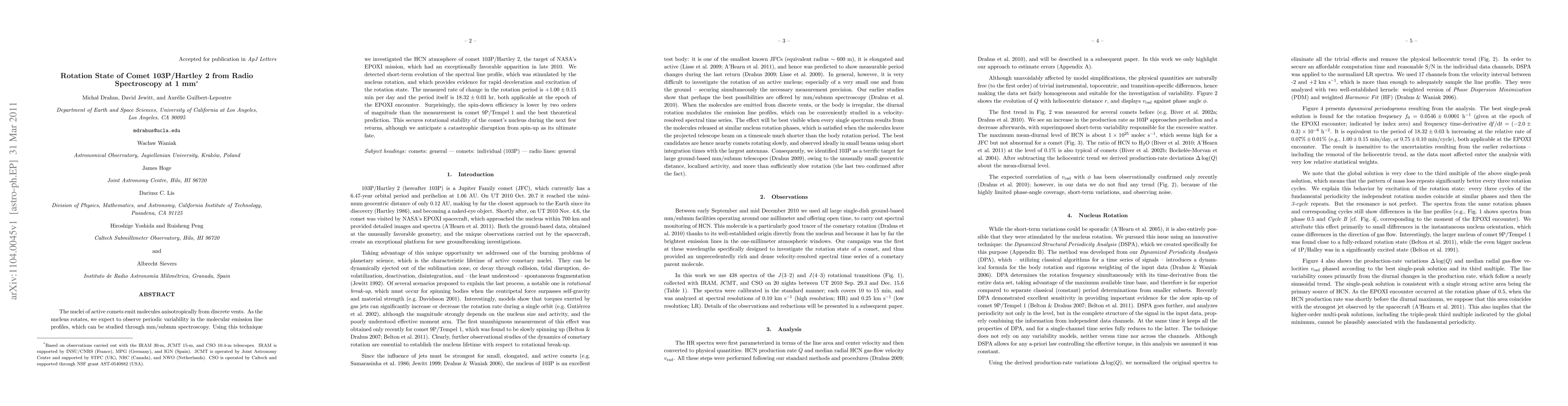 This study used 1 mm radio spectroscopy to analyze comet 103P/Hartley 2's rotation state, detecting rapid deceleration and excitation. The rotation period was found to be 18.32 ± 0.03 hr, with a spin-down efficiency lower than comet 9P/Tempel 1, suggesting nuclear stability during upcoming returns, but predicting eventual catastrophic disruption from spin-up.
