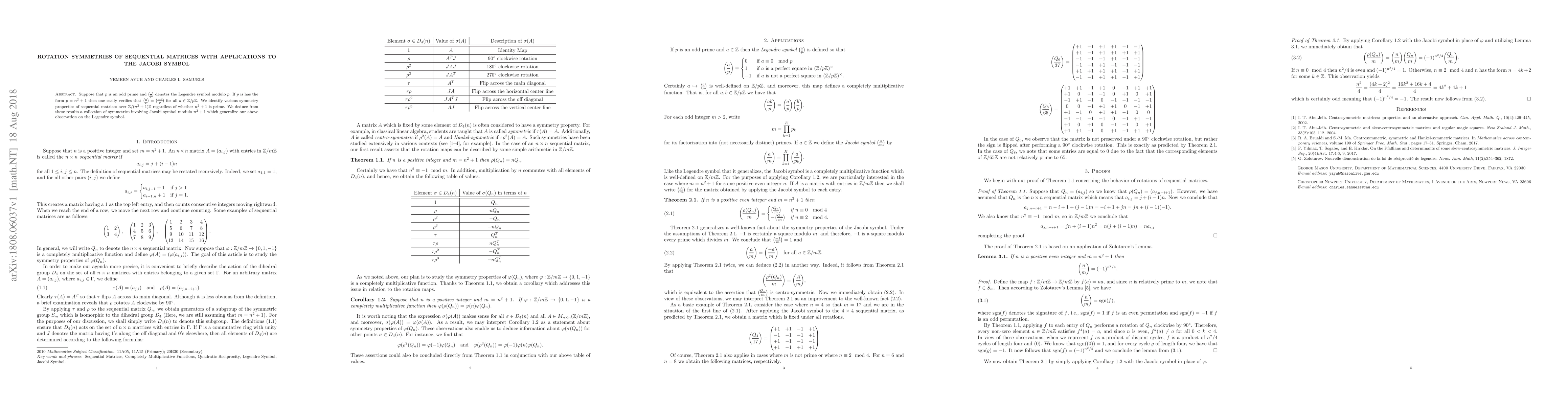The paper presents novel theorems and corollaries regarding the rotation symmetries of sequential matrices and their relation to the Jacobi symbol, providing a deeper understanding of multiplicative functions in modular arithmetic.