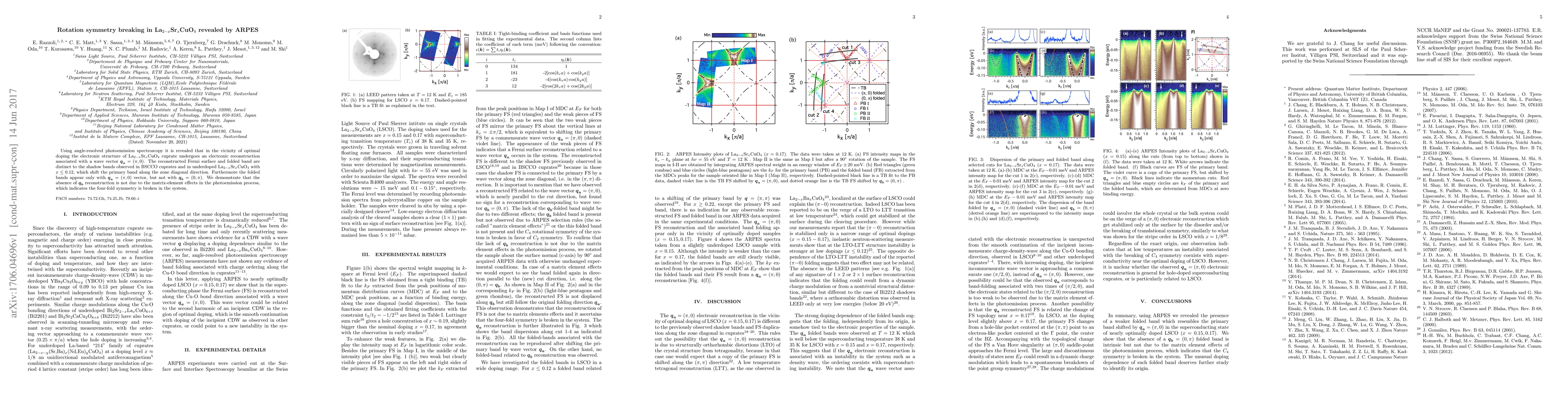 This study reveals that La2-xSrxCuO4 cuprate exhibits electronic reconstruction near optimal doping, characterized by a wave vector q_a=(pi, 0), leading to a distinct Fermi surface and folded bands. The absence of symmetry with q_b=(0, pi) indicates a four-fold rotation symmetry breaking in the system.