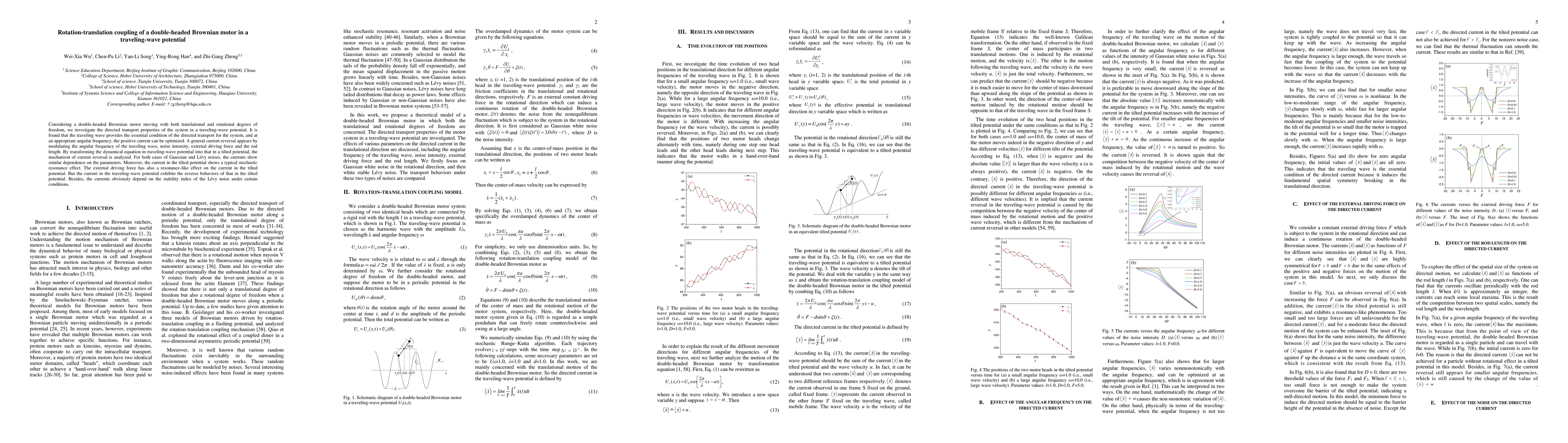 Considering a double-headed Brownian motor moving with both translational and rotational degrees of freedom, we investigate the directed transport properties of the system in a traveling-wave potential. It is found that the traveling wave provides the essential condition of the directed transport for the system, and at an appropriate angular frequency, the positive current can be optimized. A general current reversal appears by modulating the angular frequency of the traveling wave, noise intensity, external driving force and the rod length. By transforming the dynamical equation in traveling-wave potential into that in a tilted potential, the mechanism of current reversal is analyzed. For both cases of Gaussian and Levy noises, the currents show similar dependence on the parameters. Moreover, the current in the tilted potential shows a typical stochastic resonance effect. The external driving force has also a resonance-like effect on the current in the tilted potential. But the current in the traveling-wave potential exhibits the reverse behaviors of that in the tilted potential. Besides, the currents obviously depend on the stability index of the Levy noise under certain conditions.