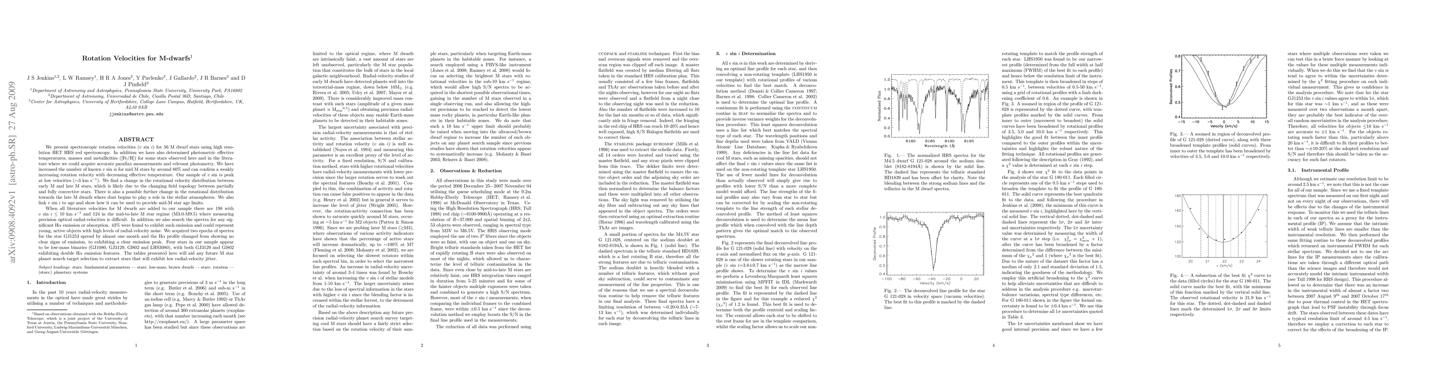 This paper reports spectroscopic rotation velocities for 56 M-dwarf stars, significantly increasing the known data for mid M stars by 80%. It finds a correlation between rotation velocity and effective temperature, with a notable change in the rotational distribution between early and late M stars, likely due to differing field topologies.