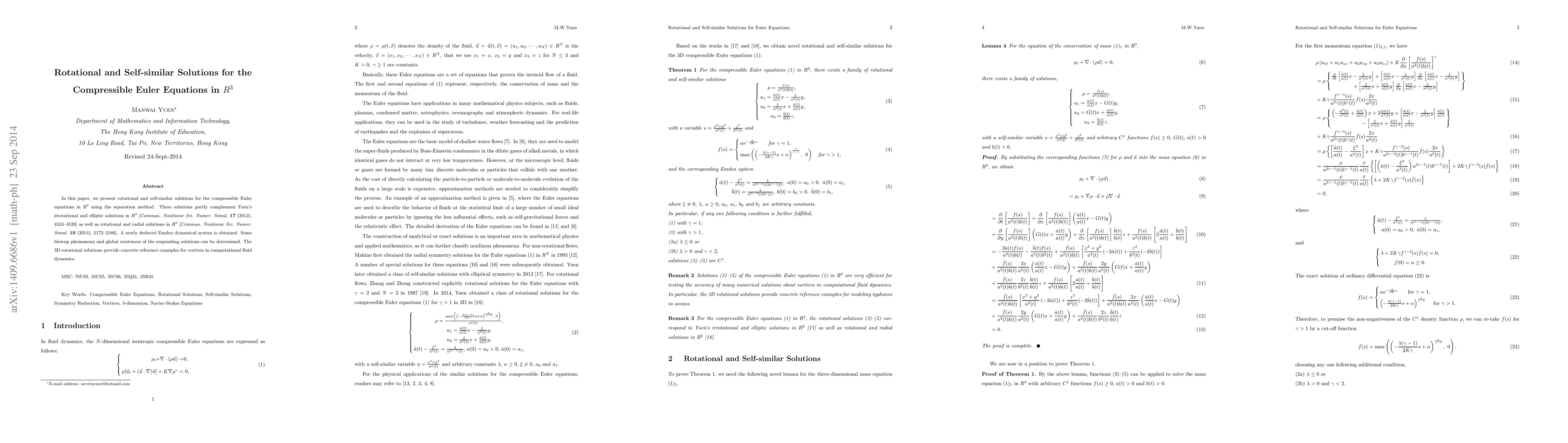 In this paper, we present rotational and self-similar solutions for the compressible Euler equations in R^3 using the separation method. These solutions partly complement Yuen's irrotational and elliptic solutions in R^3 [Commun. Nonlinear Sci. Numer. Simul. 17 (2012), 4524-4528] as well as rotational and radial solutions in R^2 [Commun. Nonlinear Sci. Numer. Simul. 19 (2014), 2172-2180]. A newly deduced Emden dynamical system is obtained. Some blowup phenomena and global existences of the responding solutions can be determined. The 3D rotational solutions provide concrete reference examples for vortices in computational fluid dynamics.