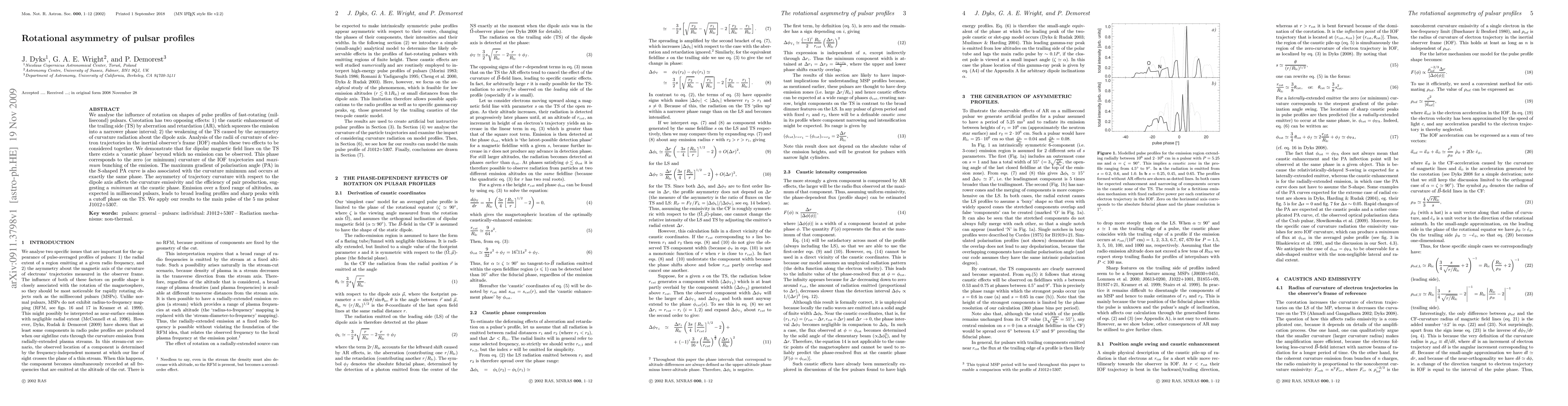 We analyse the influence of rotation on shapes of pulse profiles of fast-rotating (millisecond) pulsars. Corotation has two opposing effects: 1) the caustic enhancement of the trailing side (TS) by aberration and retardation (AR), which squeezes the emission into a narrower phase interval; 2) the weakening of the TS caused by the asymmetry of curvature radiation about the dipole axis. Analysis of the radii of curvature of electron trajectories in the inertial observer's frame (IOF) enables these two effects to be considered together. We demonstrate that for dipolar magnetic field lines on the TS there exists a `caustic phase' beyond which no emission can be observed. This phase corresponds to the zero (or minimum) curvature of the IOF trajectories and maximum bunching of the emission. The maximum gradient of polarisation angle (PA) in the S-shaped PA curve is also associated with the curvature minimum and occurs at exactly the same phase. The asymmetry of trajectory curvature with respect to the dipole axis affects the curvature emissivity and the efficiency of pair production, suggesting a minimum at the caustic phase. Emission over a fixed range of altitudes, as expected in millisecond pulsars, leads to broad leading profiles and sharp peaks with a cutoff phase on the TS. We apply our results to the main pulse of the 5 ms pulsar J1012+5307.