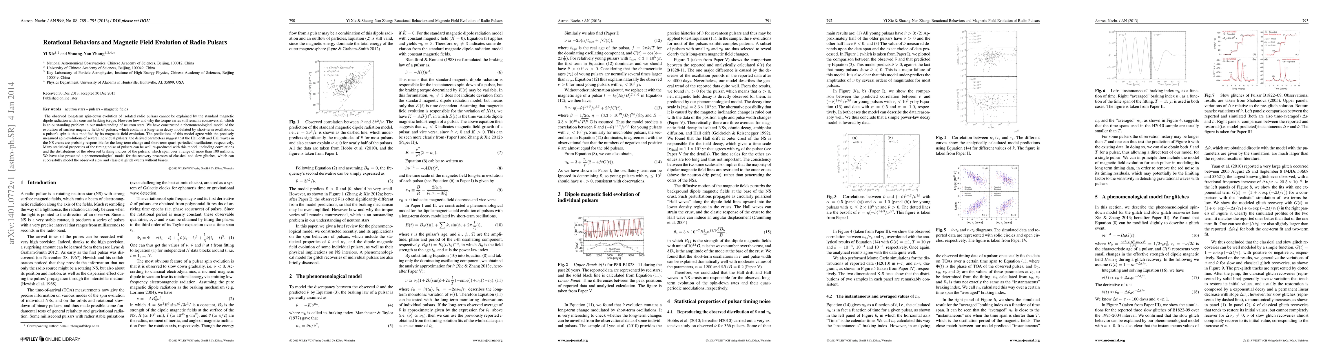 The observed long-term spin-down evolution of isolated radio pulsars cannot be explained by the standard magnetic dipole radiation with a constant braking torque. However how and why the torque varies still remains controversial, which is an outstanding problem in our understanding of neutron stars. We have constructed a phenomenological model of the evolution of surface magnetic fields of pulsars, which contains a long-term decay modulated by short-term oscillations; a pulsar's spin is thus modified by its magnetic field evolution. The predictions of this model agree with the precisely measured spin evolutions of several individual pulsars; the derived parameters suggest that the Hall drift and Hall waves in the NS crusts are probably responsible for the long-term change and short-term quasi-periodical oscillations, respectively. Many statistical properties of the timing noise of pulsars can be well re-produced with this model, including correlations and the distributions of the observed braking indices of the pulsars, which span over a range of more than 100 millions. We have also presented a phenomenological model for the recovery processes of classical and slow glitches, which can successfully model the observed slow and classical glitch events without biases.