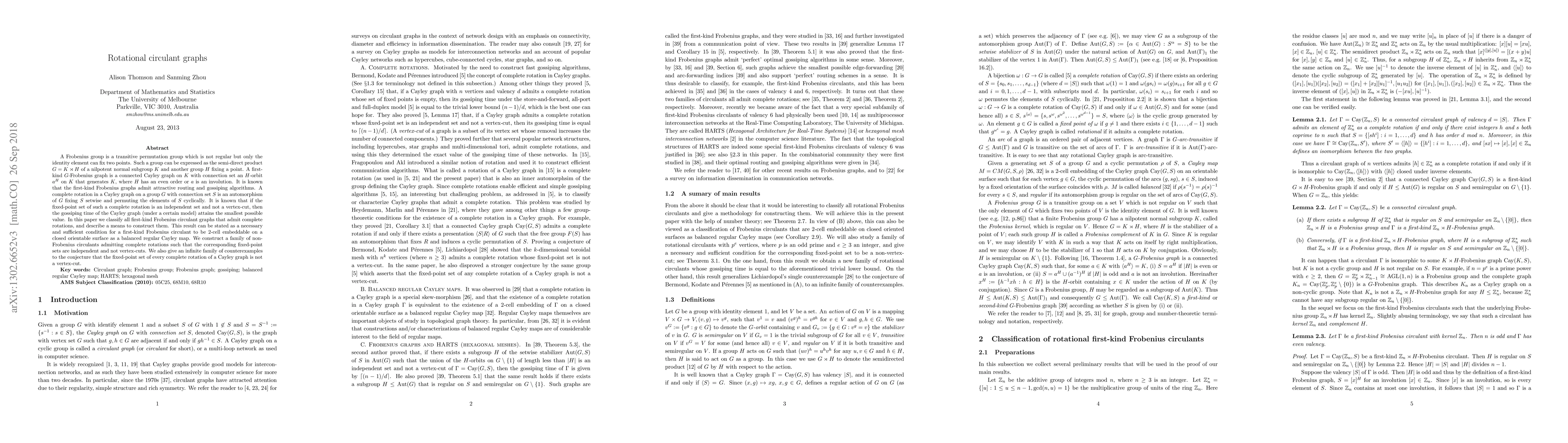 A Frobenius group is a transitive permutation group which is not regular but only the identity element can fix two points. Such a group can be expressed as the semi-direct product $G = K \rtimes H$ of a nilpotent normal subgroup $K$ and another group $H$ fixing a point. A first-kind $G$-Frobenius graph is a connected Cayley graph on $K$ with connection set an $H$-orbit $a^H$ on $K$ that generates $K$, where $H$ has an even order or $a$ is an involution. It is known that the first-kind Frobenius graphs admit attractive routing and gossiping algorithms. A complete rotation in a Cayley graph on a group $G$ with connection set $S$ is an automorphism of $G$ fixing $S$ setwise and permuting the elements of $S$ cyclically. It is known that if the fixed-point set of such a complete rotation is an independent set and not a vertex-cut, then the gossiping time of the Cayley graph (under a certain model) attains the smallest possible value. In this paper we classify all first-kind Frobenius circulant graphs that admit complete rotations, and describe a means to construct them. This result can be stated as a necessary and sufficient condition for a first-kind Frobenius circulant to be 2-cell embeddable on a closed orientable surface as a balanced regular Cayley map. We construct a family of non-Frobenius circulants admitting complete rotations such that the corresponding fixed-point sets are independent and not vertex-cuts. We also give an infinite family of counterexamples to the conjecture that the fixed-point set of every complete rotation of a Cayley graph is not a vertex-cut.