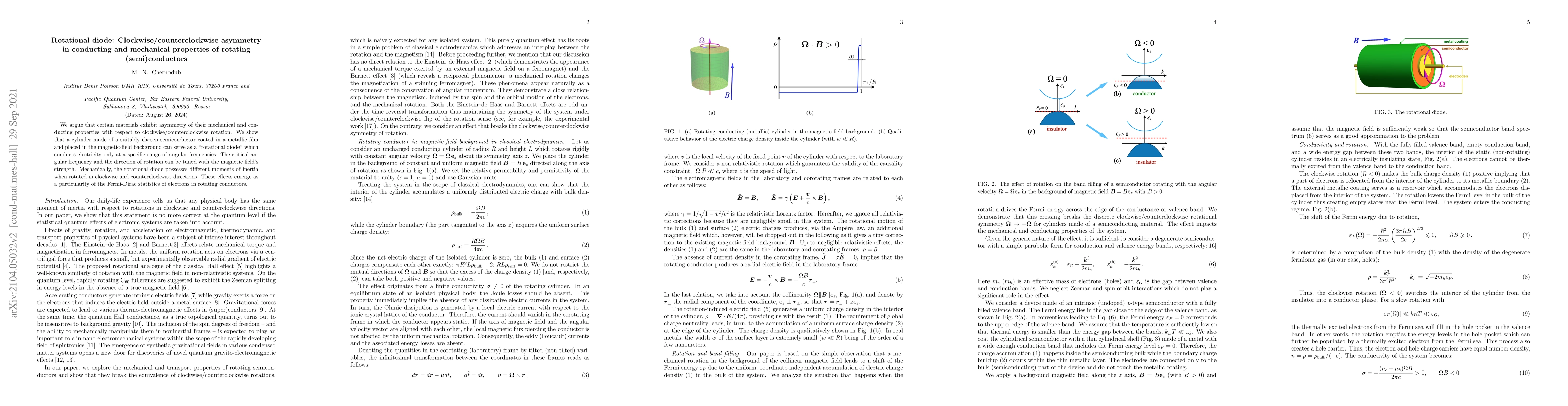 We argue that certain materials exhibit asymmetry of their mechanical and conducting properties with respect to clockwise/counterclockwise rotation. We show that a cylinder made of a suitably chosen semiconductor coated in a metallic film and placed in the magnetic-field background can serve as a "rotational diode" which conducts electricity only at a specific range of angular frequencies. The critical angular frequency and the direction of rotation can be tuned with the magnetic field's strength. Mechanically, the rotational diode possesses different moments of inertia when rotated in clockwise and counterclockwise directions. These effects emerge as a particularity of the Fermi-Dirac statistics of electrons in rotating conductors.