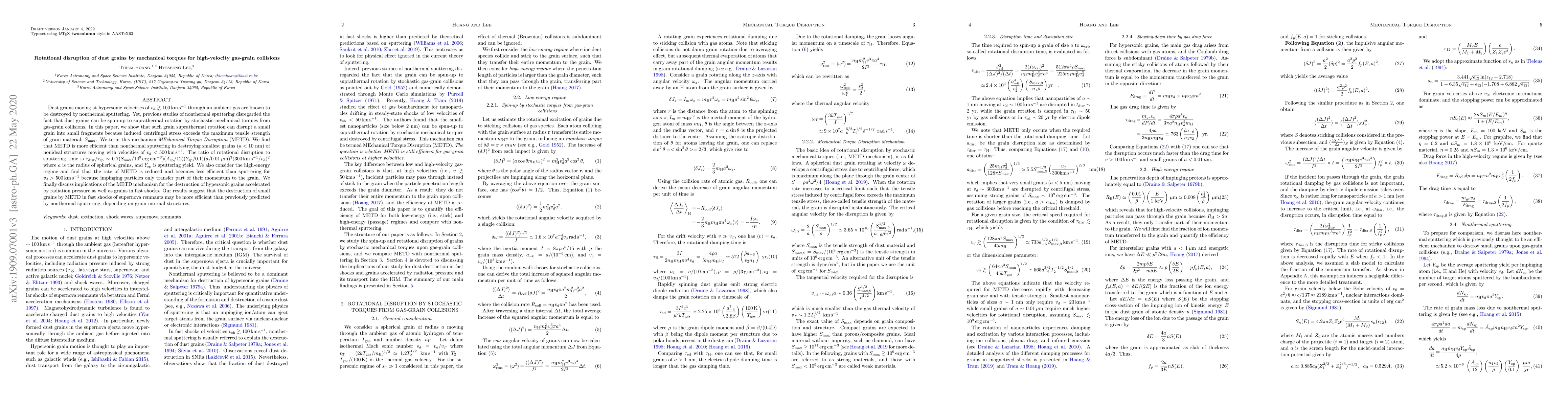 This paper investigates the rotational disruption of dust grains due to mechanical torques from gas-grain collisions at hypersonic velocities, termed MEchanical Torque Disruption (METD). It finds that METD is more efficient than nonthermal sputtering in destroying small grains with sizes less than 10 nm at velocities below 500 km/s, but becomes less effective at higher velocities due to reduced momentum transfer.