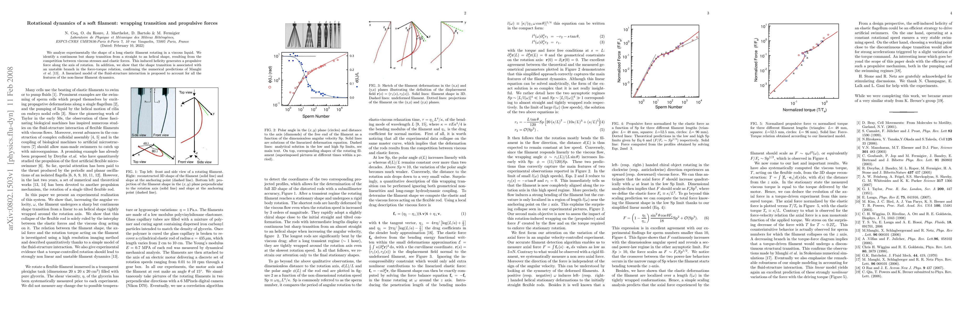 This study experimentally investigates the rotational dynamics of a long elastic filament in a viscous liquid, identifying a transition from straight to helical shape due to the interplay of viscous and elastic forces. The helical shape generates propulsive forces along the filament's axis, with an associated unstable branch in the force-torque relation, modeled through a linearized fluid-structure interaction framework.
