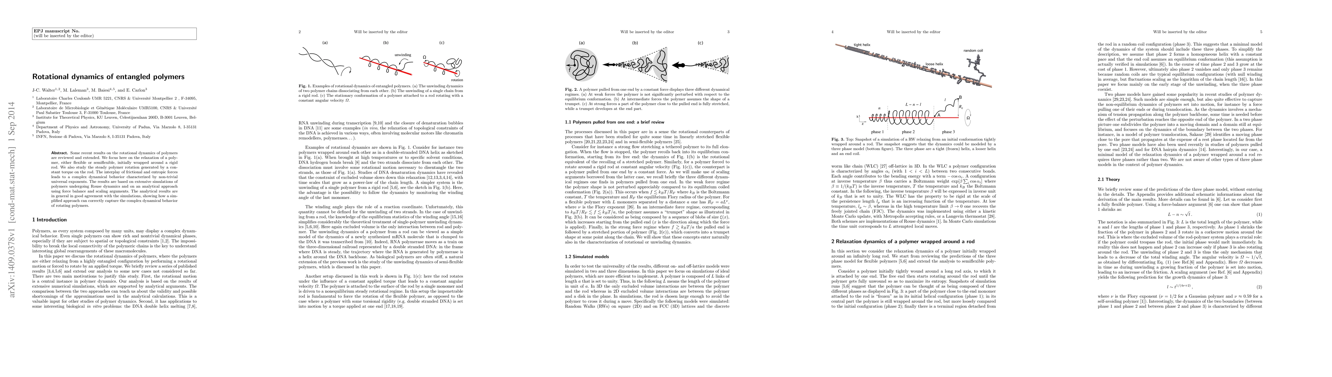 Some recent results on the rotational dynamics of polymers are reviewed and extended. We focus here on the relaxation of a polymer, either flexible or semiflexible, initially wrapped around a rigid rod. We also study the steady polymer rotation generated by a constant torque on the rod. The interplay of frictional and entropic forces leads to a complex dynamical behavior characterized by non-trivial universal exponents. The results are based on extensive simulations of polymers undergoing Rouse dynamics and on an analytical approach using force balance and scaling arguments. The analytical results are in general in good agreement with the simulations, showing how a simplified approach can correctly capture the complex dynamical behavior of rotating polymers.