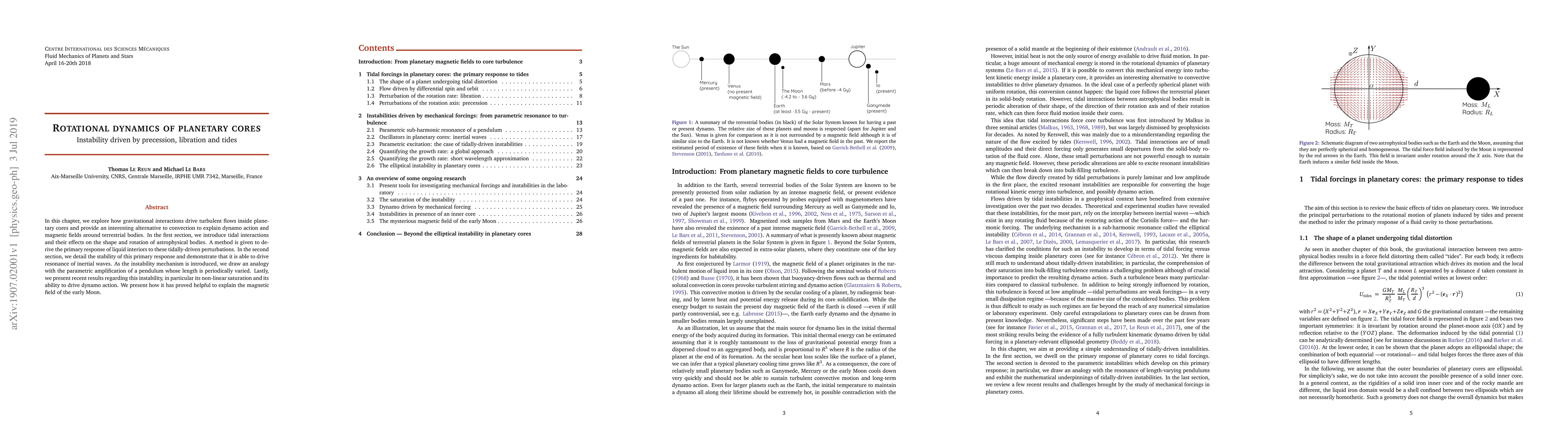 In this chapter, we explore how gravitational interactions drive turbulent flows inside planetary cores and provide an interesting alternative to convection to explain dynamo action and magnetic fields around terrestrial bodies. In the first section, we introduce tidal interactions and their effects on the shape and rotation of astrophysical bodies. A method is given to derive the primary response of liquid interiors to these tidally-driven perturbations. In the second section, we detail the stability of this primary response and demonstrate that it is able to drive resonance of inertial waves. As the instability mechanism is introduced, we draw an analogy with the parametric amplification of a pendulum whose length is periodically varied. Lastly, we present recent results regarding this instability, in particular its non-linear saturation and its ability to drive dynamo action. We present how it has proved helpful to explain the magnetic field of the early Moon.