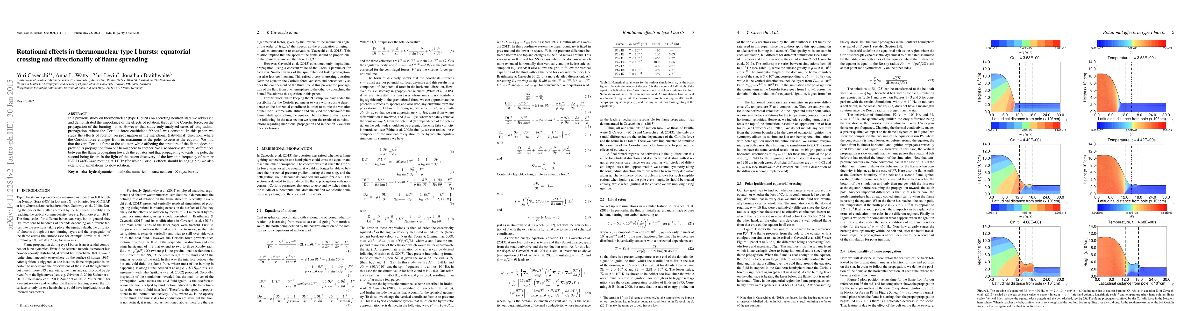 In a previous study on thermonuclear (type I) nursts on accreting neutron stars we addressed and demonstrated the importance of the effects of rotation, through the Coriolis force, on the propagation of the burning flame. However, that study only analysed cases of longitudinal propagation, where the Coriolis force coefficient $2\Omega\cos\theta$ was constant. In this paper, we study the effects of rotation on propagation in the meridional (latitudinal) direction, where the Coriolis force changes from its maximum at the poles to zero at the equator. We find that the zero Coriolis force at the equator, while affecting the structure of the flame, does not prevent its propagation from one hemisphere to another. We also observe structural differences between the flame propagating towards the equator and that propagating towards the pole, the second being faster. In the light of the recent discovery of the low spin frequency of burster IGR~J17480-2446 rotating at 11 Hz (for which Coriolis effects should be negligible) we also extend our simulations to slow rotation.
