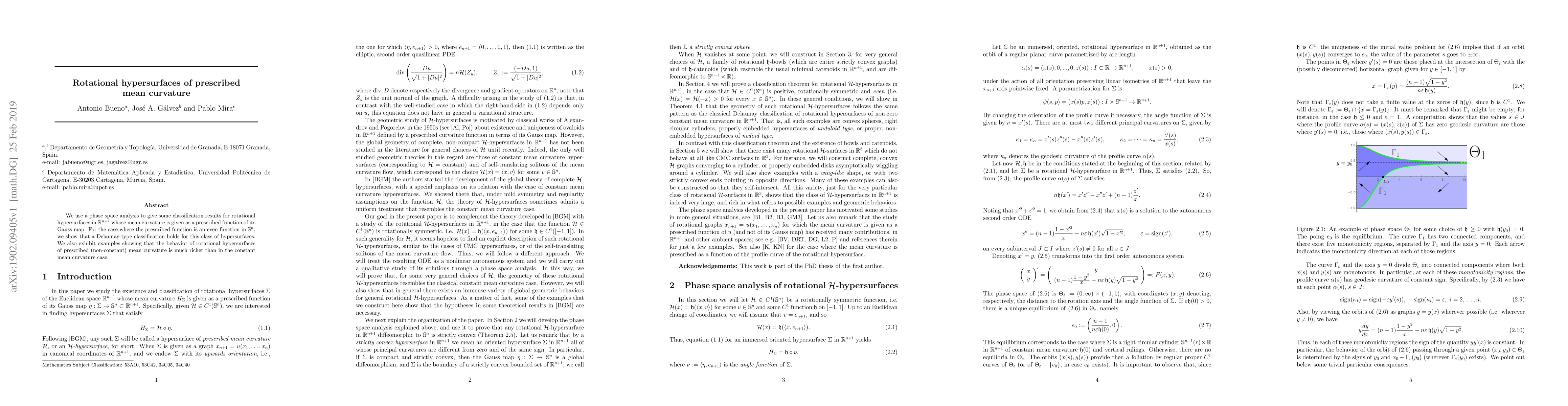 Summary: This paper classifies rotational hypersurfaces in $\mathbb{R}^{n+1}$ with prescribed mean curvature using phase space analysis, showing a Delaunay-type classification for even functions and illustrating the complexity of non-constant mean curvature cases.