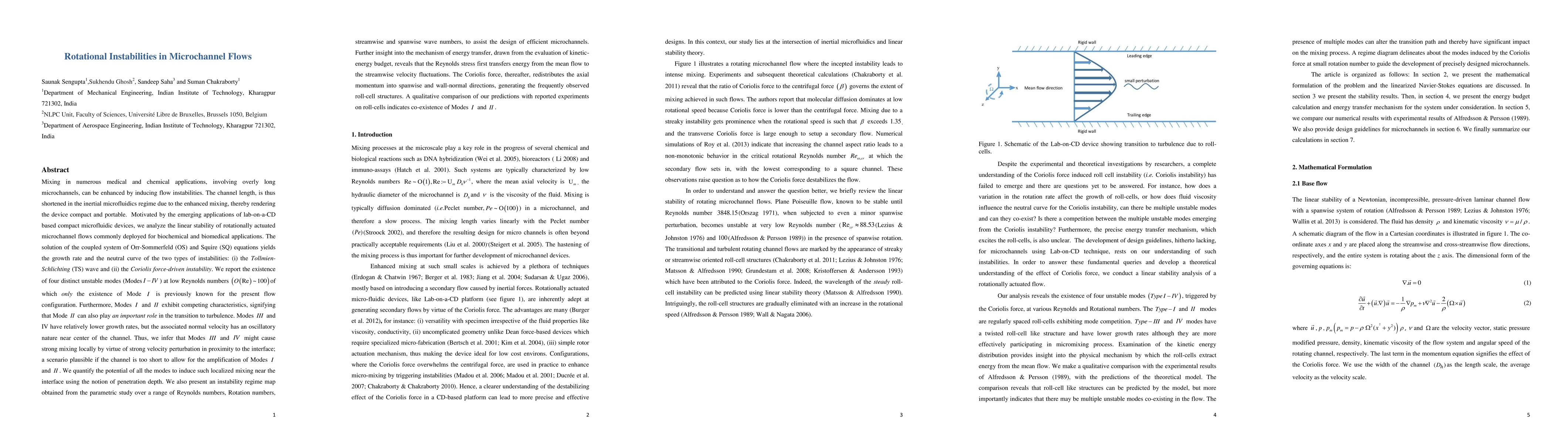Mixing in numerous medical and chemical applications, involving overly long microchannels, can be enhanced by inducing flow instabilities. The channel length, is thus shortened in the inertial microfluidics regime due to the enhanced mixing, thereby rendering the device compact and portable. Motivated by the emerging applications of lab-on-a-CD based compact microfluidic devices, we analyze the linear stability of rotationally actuated microchannel flows commonly deployed for biochemical and biomedical applications. The solution of the coupled system of Orr-Sommerfeld (OS) and Squire (SQ) equations yields the growth rate and the neutral curve of the two types of instabilities: (i) the Tollmien-Schlichting (TS) wave and (ii) the Coriolis force-driven instability. We report the existence of four distinct unstable modes (Modes I-IV) at low Reynolds numbers of which only the existence of Mode I is previously known for the present flow configuration. Furthermore, Modes I and II exhibit competing characteristics. We infer that Modes III and IV might cause strong mixing locally by virtue of strong velocity perturbation in proximity to the interface. We quantify the potential of all the modes to induce such localized mixing near the interface using the notion of penetration depth. Further, insight into the mechanism of energy transfer, drawn from the evaluation of kinetic-energy budget, reveals that the Reynolds stress first transfers energy from the mean flow to the streamwise velocity fluctuations. The Coriolis force, thereafter, redistributes the axial momentum into spanwise and wall-normal directions, generating the frequently observed roll-cell structures. A qualitative comparison of our predictions with reported experiments on roll-cells indicates co-existence of Modes I and II.