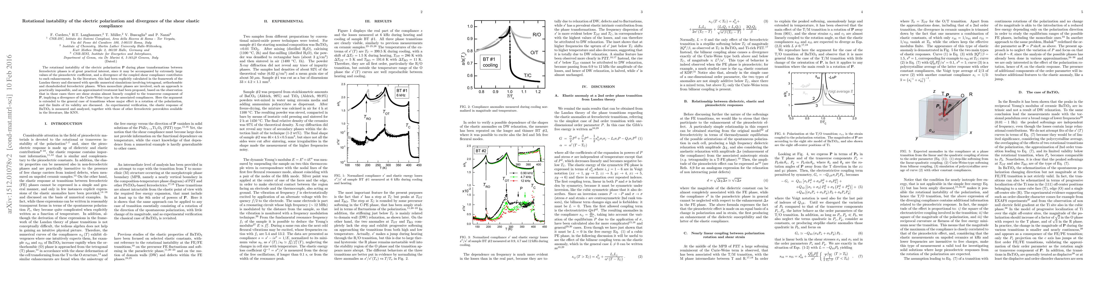 The rotational instability of the electric polarization P during phase transformations between ferroelectric phases is of great practical interest, since it may be accompanied by extremely large values of the piezoelectric coefficient, and a divergence of the coupled shear compliance contributes to such enhancements. In the literature, this had been explicitly calculated in the framework of the Landau theory and discussed with specific numerical simulations involving tetragonal, orthorhombic and rhombohedral ferroelectric phases. When monoclinic phases are involved, such an approach is practically impossible, and an approximated treatment had been proposed, based on the observation that in those cases there are shear strains almost linearly coupled to the transverse component of P, implying a divergence of the Curie-Weiss type in the associated compliances. Here the argument is extended to the general case of transitions whose major effect is a rotation of the polarization, and the limits of its validity are discussed. As experimental verification, the elastic response of BaTiO3 is measured and analyzed, together with those of other ferroelectric perovskites available in the literature, like KNN.