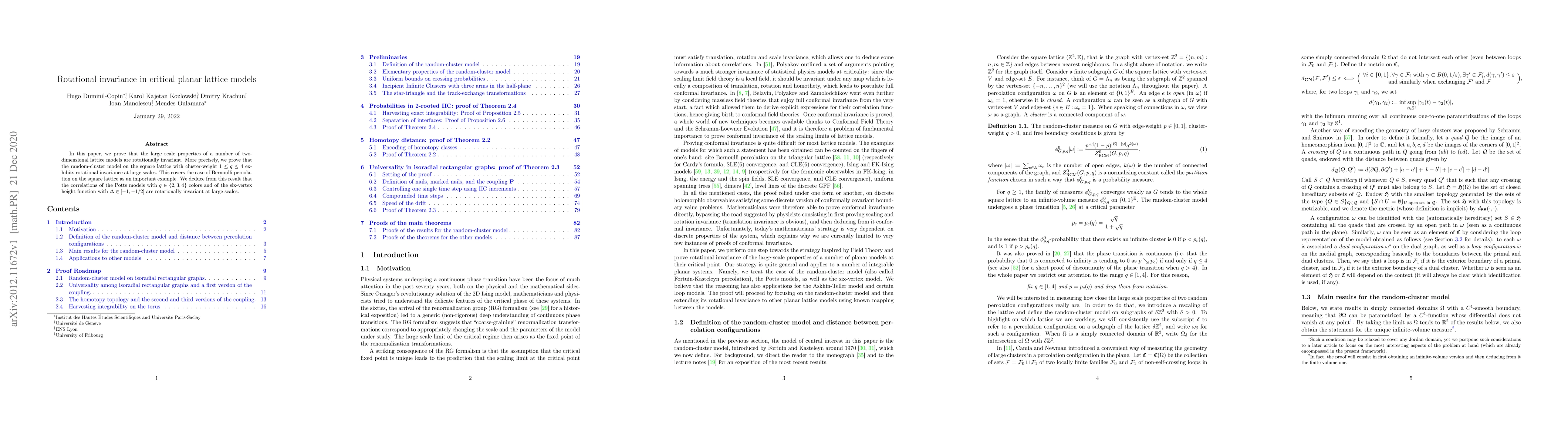 The research paper proves that certain 2D lattice models exhibit rotational invariance at large scales, including the random-cluster model and Potts models, with implications for understanding their correlations and properties.