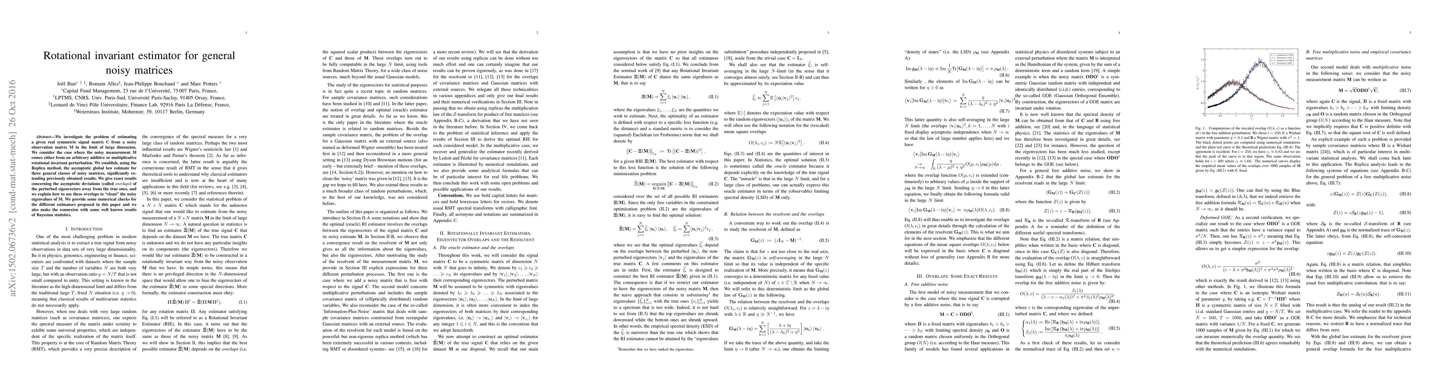 We investigate the problem of estimating a given real symmetric signal matrix $\textbf{C}$ from a noisy observation matrix $\textbf{M}$ in the limit of large dimension. We consider the case where the noisy measurement $\textbf{M}$ comes either from an arbitrary additive or multiplicative rotational invariant perturbation. We establish, using the Replica method, the asymptotic global law estimate for three general classes of noisy matrices, significantly extending previously obtained results. We give exact results concerning the asymptotic deviations (called overlaps) of the perturbed eigenvectors away from the true ones, and we explain how to use these overlaps to "clean" the noisy eigenvalues of $\textbf{M}$. We provide some numerical checks for the different estimators proposed in this paper and we also make the connection with some well known results of Bayesian statistics.