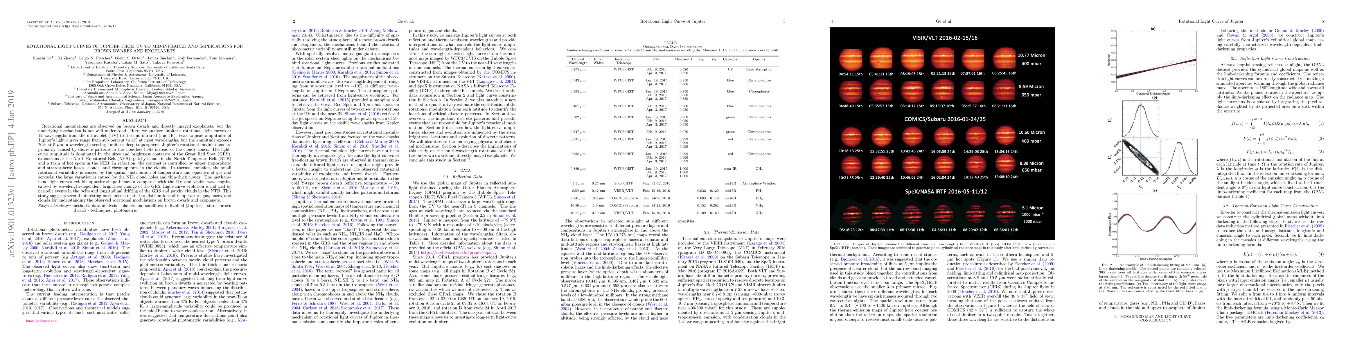 This study analyzes Jupiter's rotational light curves across 12 wavelengths from UV to mid-IR, revealing that modulations are primarily driven by cloudless belts and influenced by atmospheric features like the GRS and hazes. The findings provide insights into the mechanisms behind rotational modulations observed in brown dwarfs and exoplanets.