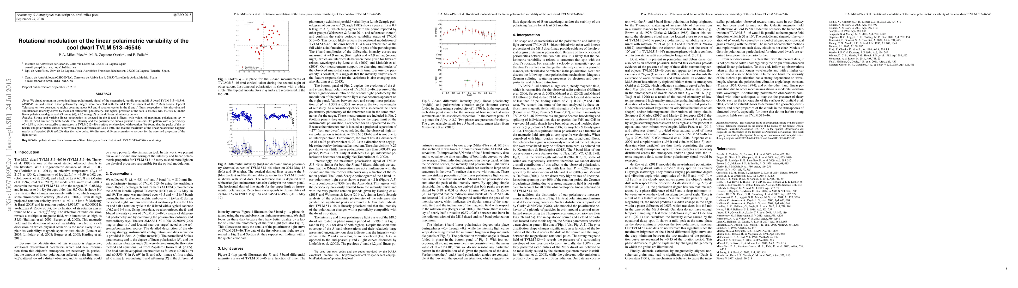 Aims: We aimed to monitor the optical linear polarimetric signal of the magnetized, rapidly rotating M8.5 dwarf TVLM 513$-$46546. Methods: $R$- and $I$-band linear polarimetry images were collected with the ALFOSC instrument of the 2.56-m Nordic Optical Telescope on two consecutive nights covering about 0.5 and 4 rotation cycles in the $R$ and $I$ filters, respectively. We also obtained simultaneous intensity curves by means of differential photometry. The typical precision of the data is $\pm$0.46\% ($R$), $\pm$0.35\% ($I$) in the linear polarization degree and $\pm$9 mmag ($R$), $\pm$1.6 mmag ($I$) in the differential intensity curves. Results: Strong and variable linear polarization is detected in the $R$ and $I$ filters, with values of maximum polarization ($p^{*}$ = 1.30$\pm$0.35 \%) similar for both bands. The intensity and the polarimetric curves present a sinusoid-like pattern with a periodicity of $\sim$1.98 h, which we ascribe to structures in TVLM 513$-$46's surface synchronized with rotation. We found that the peaks of the intensity and polarimetric curves occur with a phase difference of 0.18$\pm$0.01, and that the maximum of the linear polarization happens nearly half a period (0.59$\pm$0.03) after the radio pulse. We discussed different scenarios to account for the observed properties of the light curves.