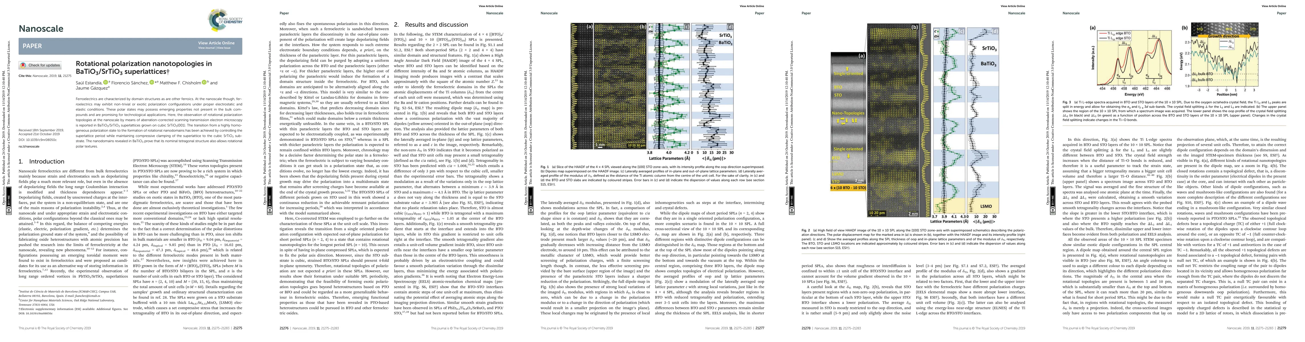 This paper reports the observation of rotational polarization nanodomains in BaTiO3/SrTiO3 superlattices using aberration-corrected scanning transmission electron microscopy. The study demonstrates how controlling the superlattice period can induce these exotic polarization configurations, revealing new potential for nanoscale ferroelectric applications.