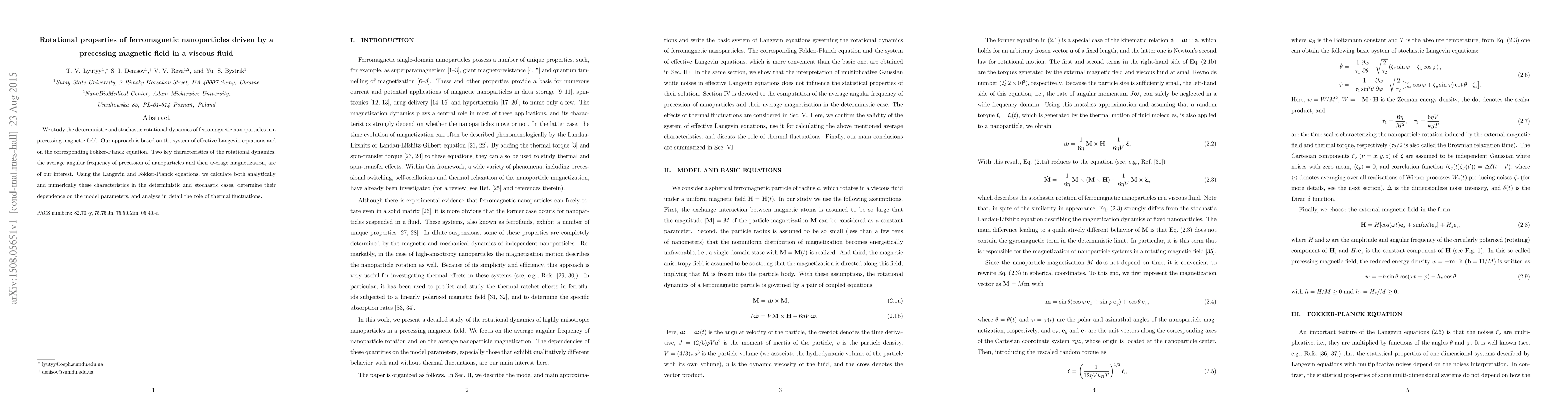 This research analyzes the rotational behavior of ferromagnetic nanoparticles in a precessing magnetic field within a viscous fluid. Utilizing Langevin and Fokker-Planck equations, the study calculates and examines the average angular frequency of precession and magnetization of nanoparticles. It explores both deterministic and stochastic dynamics, determining the impact of thermal fluctuations and model parameters on these characteristics.