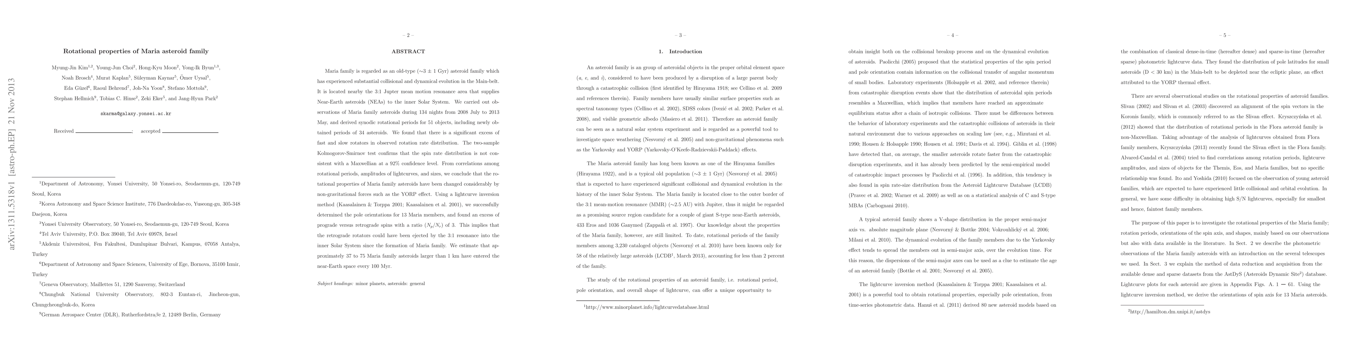 The study investigates the rotational properties of the Maria asteroid family, revealing a significant excess of fast and slow rotators, and a non-Maxwellian spin rate distribution. The findings suggest that non-gravitational forces, like the YORP effect, have considerably altered the rotational characteristics, with a higher prevalence of prograde spins and an estimated 37 to 75 near-Earth asteroids larger than 1 km originating from the family every 100 Myr.