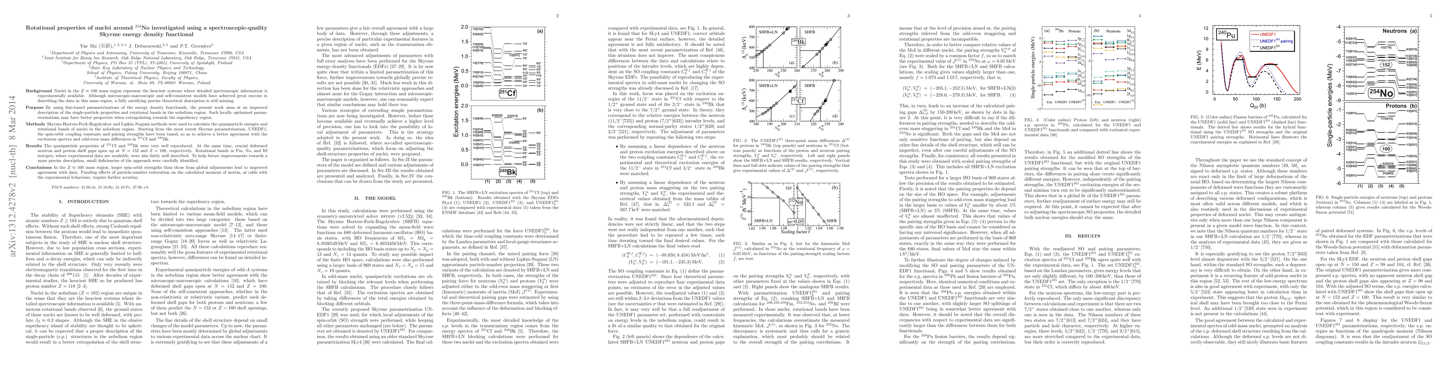 Nuclei in the $Z\approx100$ mass region represent the heaviest systems where detailed spectroscopic information is experimentally available. Although microscopic-macroscopic and self-consistent models have achieved great success in describing the data in this mass region, a fully satisfying precise theoretical description is still missing. By using fine-tuned parametrizations of the energy density functionals, the present work aims at an improved description of the single-particle properties and rotational bands in the nobelium region. Such locally optimized parameterizations may have better properties when extrapolating towards the superheavy region. Skyrme-Hartree-Fock-Bogolyubov and Lipkin-Nogami methods were used to calculate the quasiparticle energies and rotational bands of nuclei in the nobelium region. Starting from the most recent Skyrme parametrization, UNEDF1, the spin-orbit coupling constants and pairing strengths have been tuned, so as to achieve a better agreement with the excitation spectra and odd-even mass differences in $^{251}$Cf and $^{249}$Bk. The quasiparticle properties of $^{251}$Cf and $^{249}$Bk were very well reproduced. At the same time, crucial deformed neutron and proton shell gaps open up at $N=152$ and $Z=100$, respectively. Rotational bands in Fm, No, and Rf isotopes, where experimental data are available, were also fairly well described. To help future improvements towards a more precise description, small deficiencies of the approach were carefully identified. In the $Z\approx100$ mass region, larger spin-orbit strengths than those from global adjustments lead to improved agreement with data. Puzzling effects of particle-number restoration on the calculated moment of inertia, at odds with the experimental behaviour, require further scrutiny.
