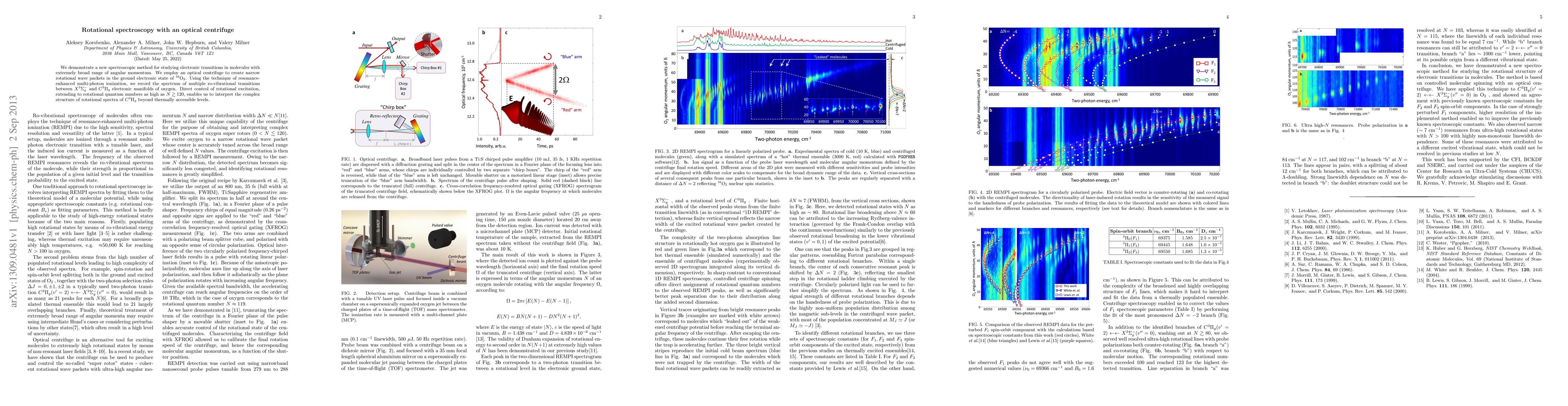 This paper introduces a novel spectroscopic method using an optical centrifuge to create narrow rotational wave packets in $^{16}$O$_2$ molecules, enabling the study of electronic transitions with high angular momentum. The technique allows for the detailed observation of ro-vibrational transitions between $X^3\Sigma_{g}^{-}$ and $C^3\Pi_{g}$ states, extending rotational quantum numbers up to $N\gtrsim 120$.