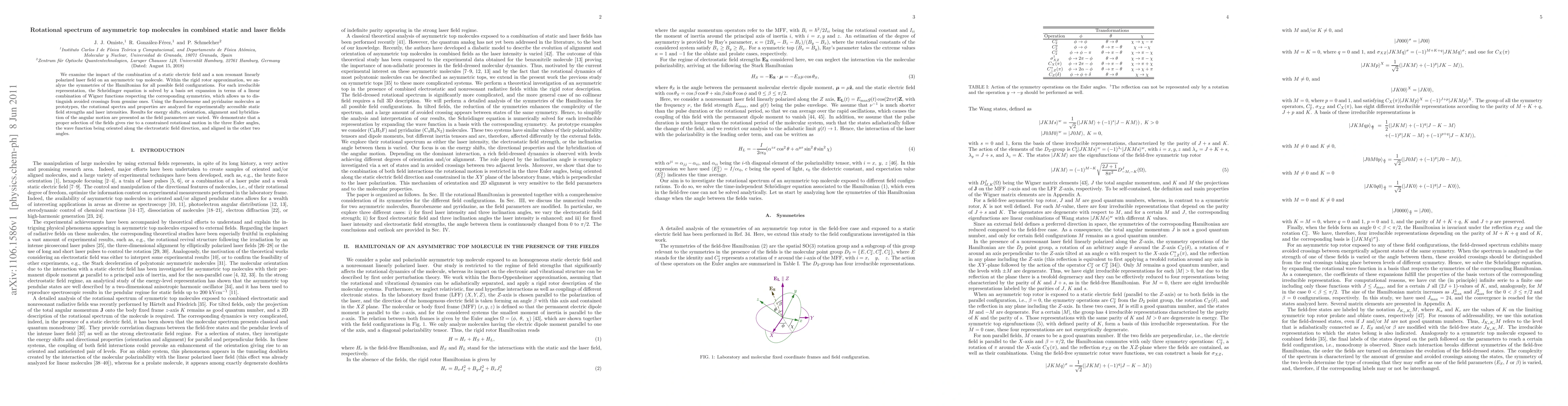 This paper investigates the rotational spectrum of asymmetric top molecules under the influence of static electric fields and non-resonant laser fields. It employs Wigner functions to solve the Schrödinger equation and demonstrates controlled rotational motion and alignment of the molecule's wave function along the electric field direction.