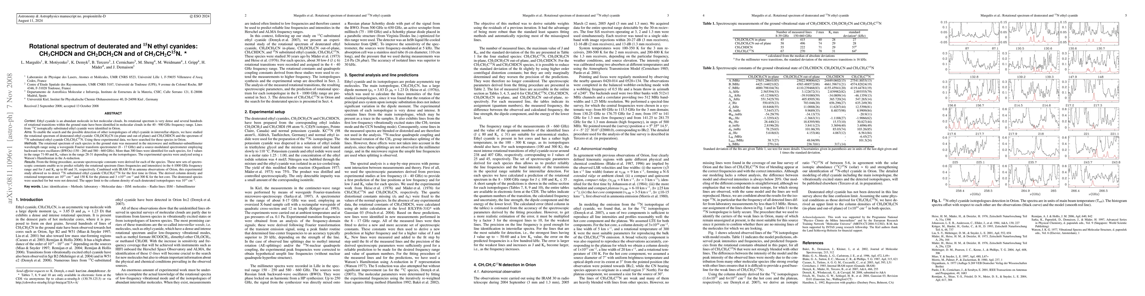 This study investigates the rotational spectra of deuterated and 15N substituted ethyl cyanides using microwave and millimeter-submillimeter techniques, enabling the prediction of their spectral lines. The 15N substituted ethyl cyanide was detected in Orion for the first time, while deuterated species remained undetected.