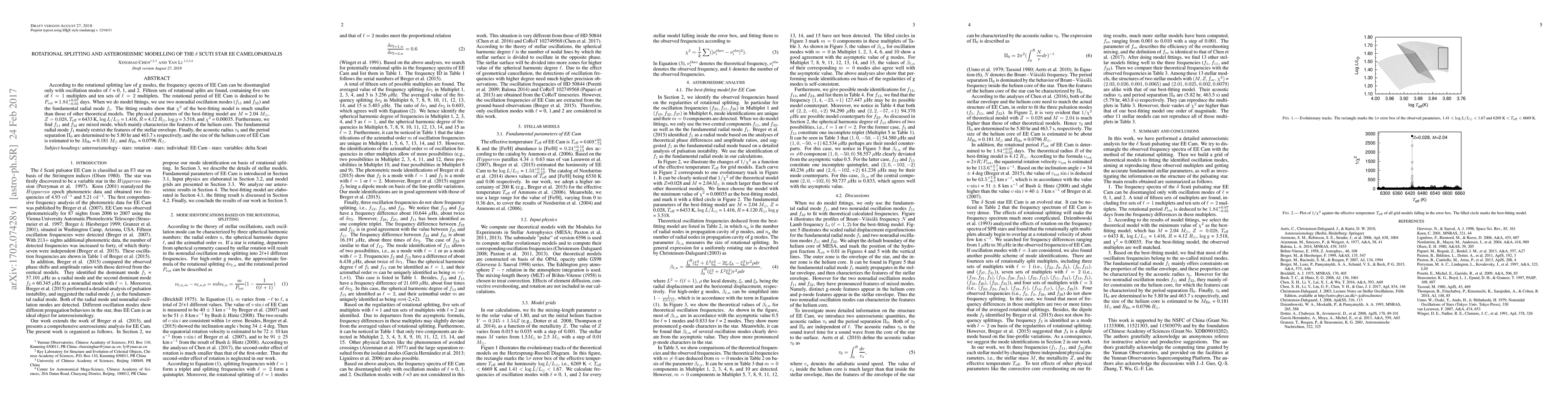 According to the rotational splitting law of g modes, the frequency spectra of EE Cam can be disentangled only with oscillation modes of $\ell$ = 0, 1, and 2. Fifteen sets of rotational splits are found, containing five sets of $\ell=1$ multiplets and ten sets of $\ell=2$ multiplets. The rotational period of EE Cam is deduced to be $P_{\rm rot}$ = $1.84_{-0.05}^{+0.07}$ days. When we do model fittings, we use two nonradial oscillation modes ($f_{11}$ and $f_{32}$) and the fundamental radial mode $f_{1}$. The fitting results show that $\chi^{2}$ of the best-fitting model is much smaller than those of other theoretical models. The physical parameters of the best-fitting model are $M$ = 2.04 $M_{\odot}$, $Z=0.028$, $T_{\rm eff}$ = 6433 K, $\log L/L_{\odot}$ = 1.416, $R$ = 4.12 $R_{\odot}$, $\log g$ = 3.518, and $\chi^{2}$ = 0.00035. Furthermore, we find $f_{11}$ and $f_{32}$ are mixed mode, which mainly characterize the features of the helium core. The fundamental radial mode $f_{1}$ mainly restrict the features of the stellar envelope. Finally, the acoustic radius $\tau_{0}$ and the period separation $\Pi_{0}$ are determined to be 5.80 hr and 463.7 s respectively, and the size of the helium core of EE Cam is estimated to be $M_{\rm He}$ = 0.181 $M_{\odot}$ and $R_{\rm He}$ = 0.0796 $R_{\odot}$.