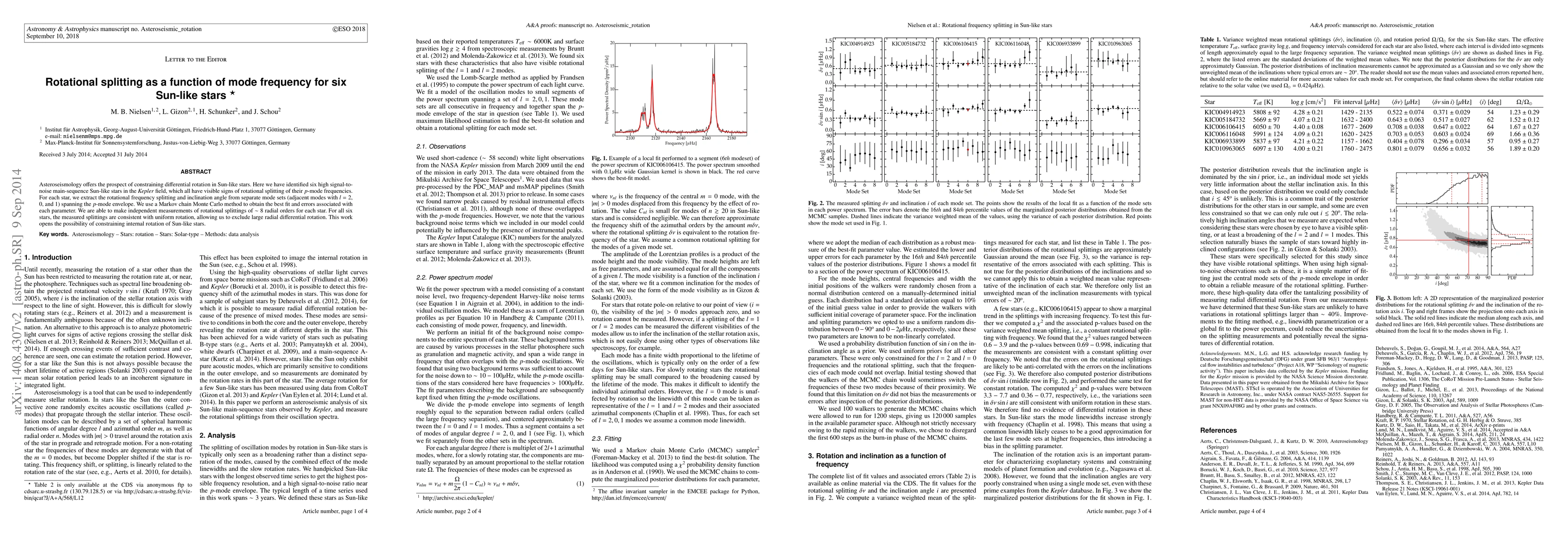 This study uses asteroseismology to analyze rotational splitting in six Sun-like stars observed by Kepler, finding consistent splittings across different modes that suggest uniform rotation, ruling out large radial differential rotation. The research employs Markov chain Monte Carlo methods to extract and analyze the data.