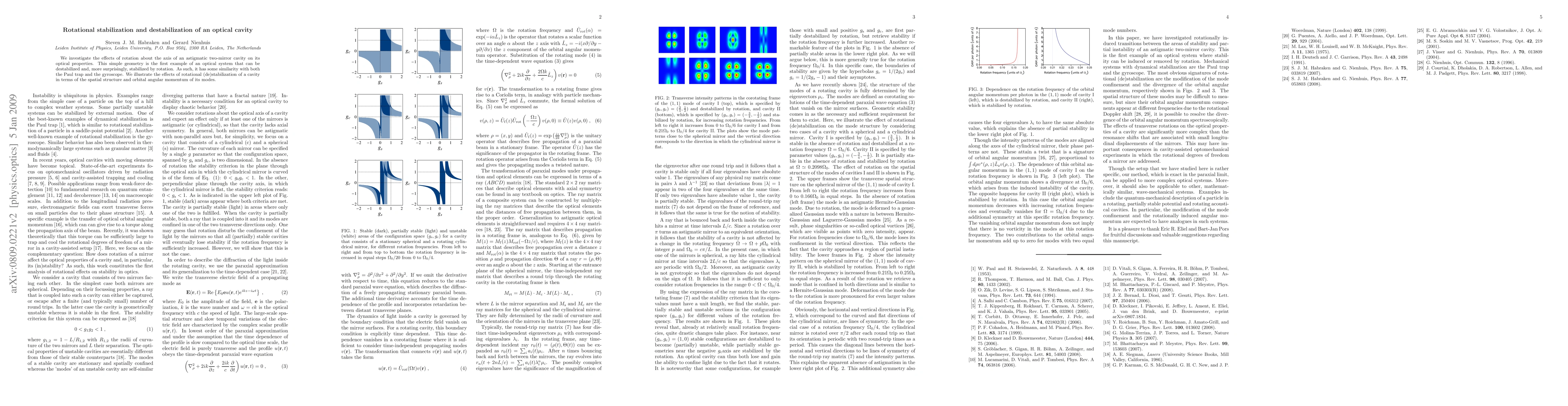 We investigate the effects of rotation about the axis of an astigmatic two-mirror cavity on its optical properties. This simple geometry is the first example of an optical system that can be destabilized and, more surprisingly, stabilized by rotation. As such, it has some similarity with both the Paul trap and the gyroscope. We illustrate the effects of rotational (de)stabilization of a cavity in terms of the spatial structure and orbital angular momentum of its modes.