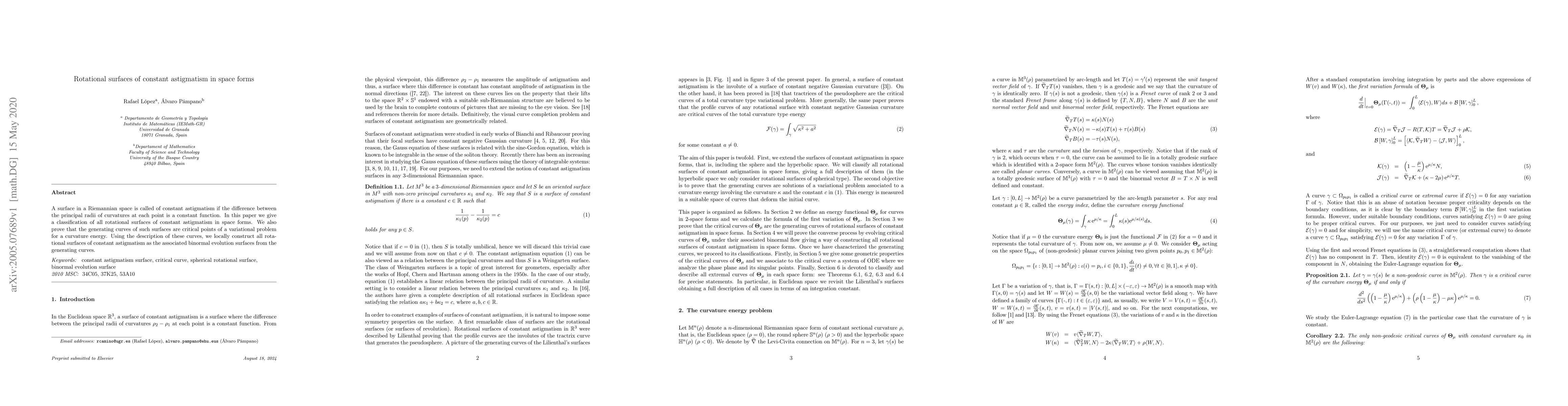 This paper classifies rotational surfaces in Riemannian space forms with constant astigmatism, proving that their generating curves are critical points of a variational curvature energy. The study also constructs these surfaces locally via binormal evolution from the generating curves.