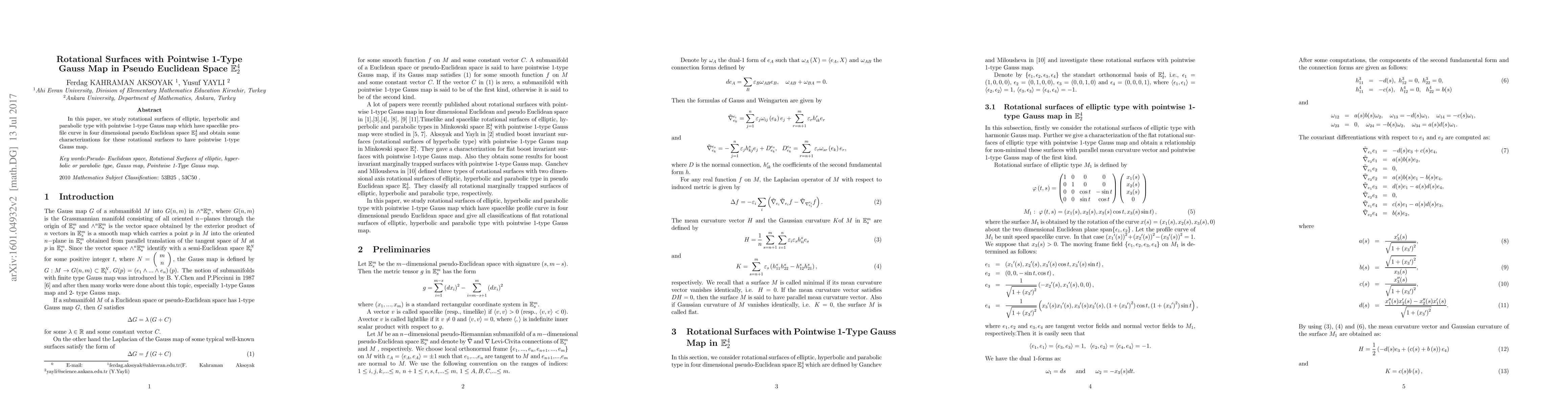 The paper studies rotational surfaces in pseudo Euclidean space E4-2, focusing on elliptic, hyperbolic, and parabolic types with pointwise 1-type Gauss map and spacelike profile curves.