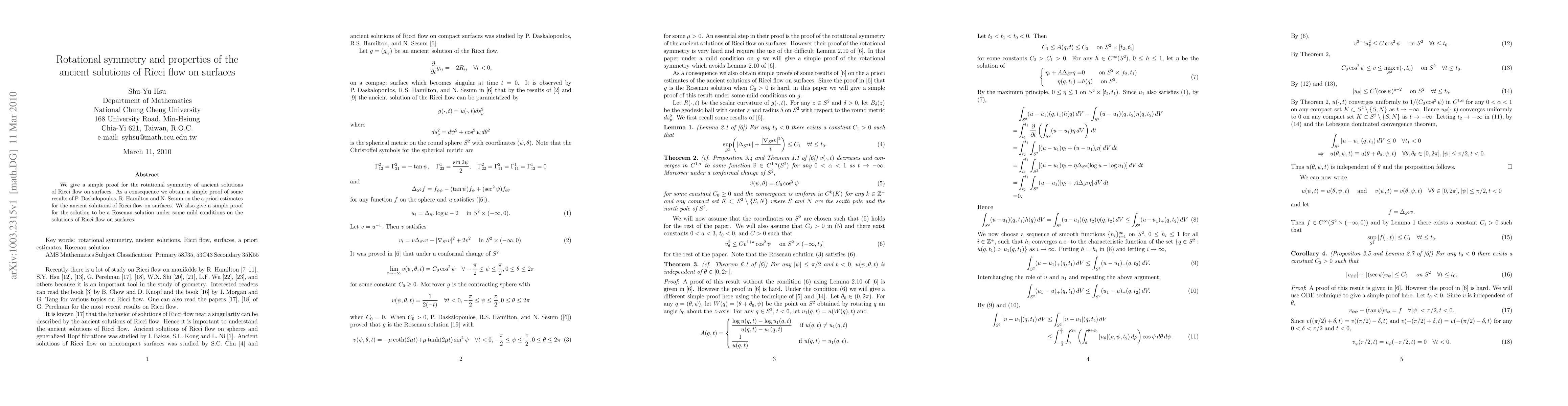 This paper provides a straightforward proof for the rotational symmetry of ancient solutions to Ricci flow on surfaces, and uses this to derive a priori estimates and establish Rosenau solutions under mild conditions.