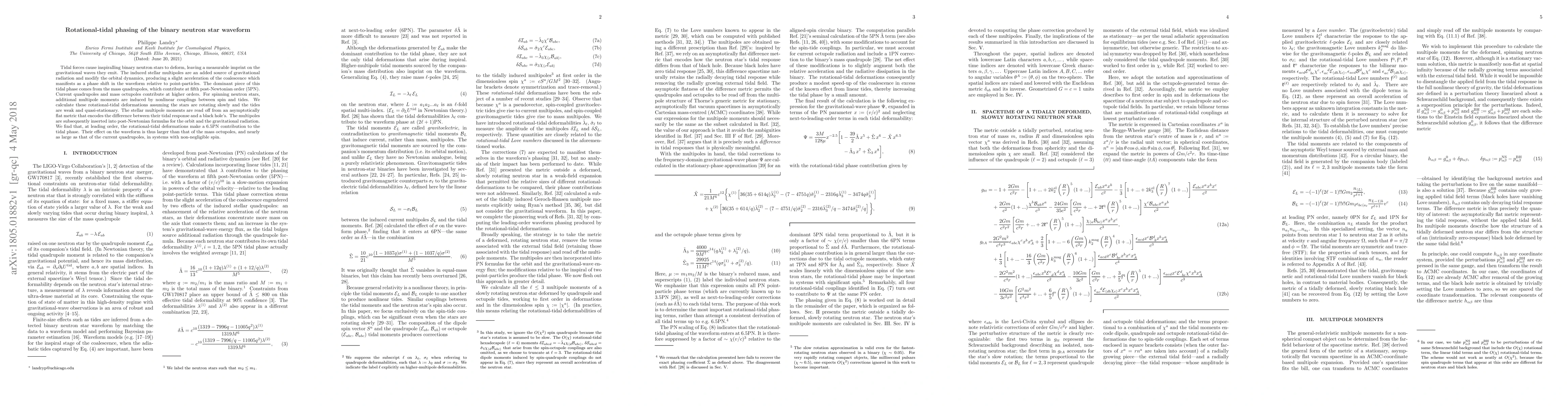 Tidal forces cause inspiralling binary neutron stars to deform, leaving a measurable imprint on the gravitational waves they emit. The induced stellar multipoles are an added source of gravitational radiation and modify the orbital dynamics, producing a slight acceleration of the coalescence which manifests as a phase shift in the waveform relative to point-particles. The dominant piece of this tidal phase comes from the mass quadrupoles, which contribute at fifth post-Newtonian order (5PN). Current quadrupoles and mass octupoles contribute at higher orders. For spinning neutron stars, additional multipole moments are induced by nonlinear couplings between spin and tides. We calculate these rotational-tidal deformations assuming the stars are rotating slowly and the tides are weak and quasi-stationary. The stellar multipole moments are read off from an asymptotically flat metric that encodes the difference between their tidal response and a black hole's. The multipoles are subsequently inserted into post-Newtonian formulas for the orbit and the gravitational radiation. We find that, at leading order, the rotational-tidal deformations make a 6.5PN contribution to the tidal phase. Their effect on the waveform is thus larger than that of the mass octupoles, and nearly as large as that of the current quadrupoles, in systems with non-negligible spin.