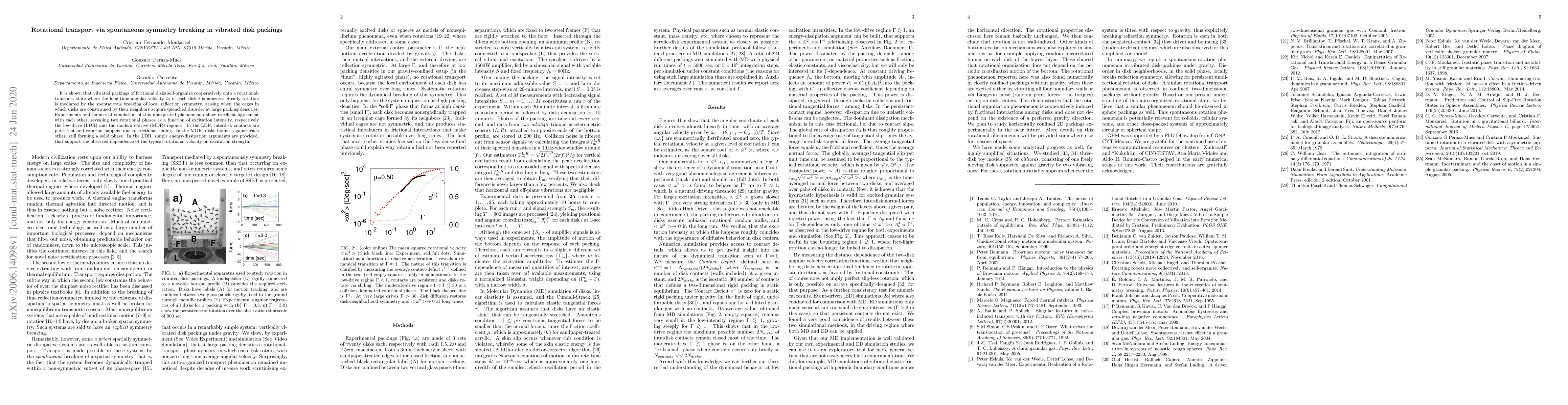 This research demonstrates that vibrated frictional disk packings spontaneously organize into a rotational-transport state, with each disk having a nonzero long-time angular velocity. Experiments and simulations reveal two rotational phases depending on excitation intensity, with distinct behaviors in low-drive (frictional sliding) and moderate-drive (bouncing) regimes. Simple energy-dissipation arguments explain the observed rotational velocity dependence on excitation strength.