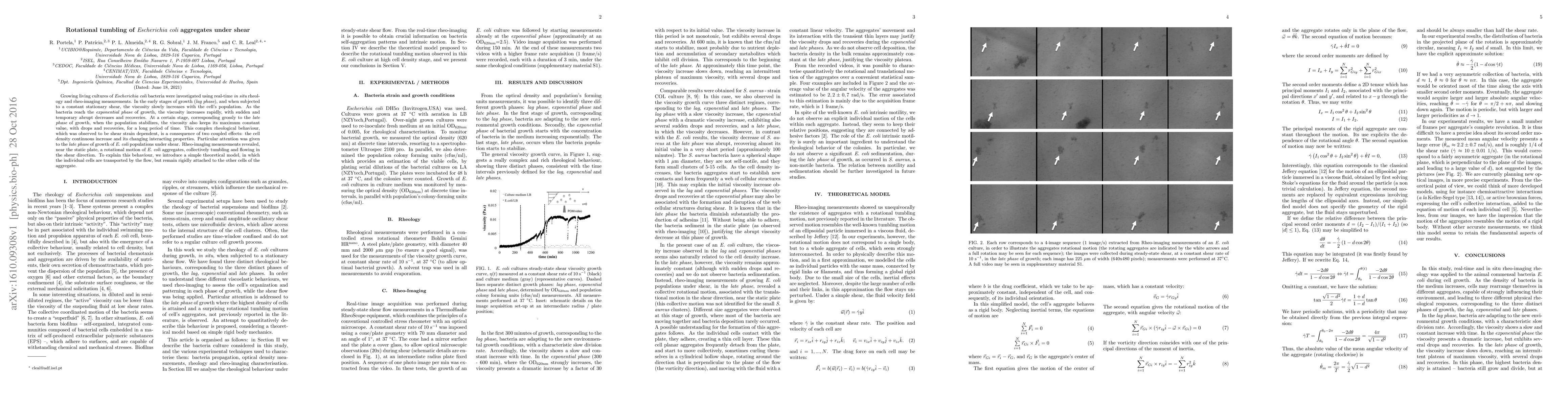 This study investigates the rheological behavior of growing Escherichia coli cultures under shear, revealing complex viscosity changes linked to bacterial growth phases. Rheo-imaging shows E. coli aggregates tumbling rotationally under shear, prompting a theoretical model explaining the collective motion of rigidly attached cells.
