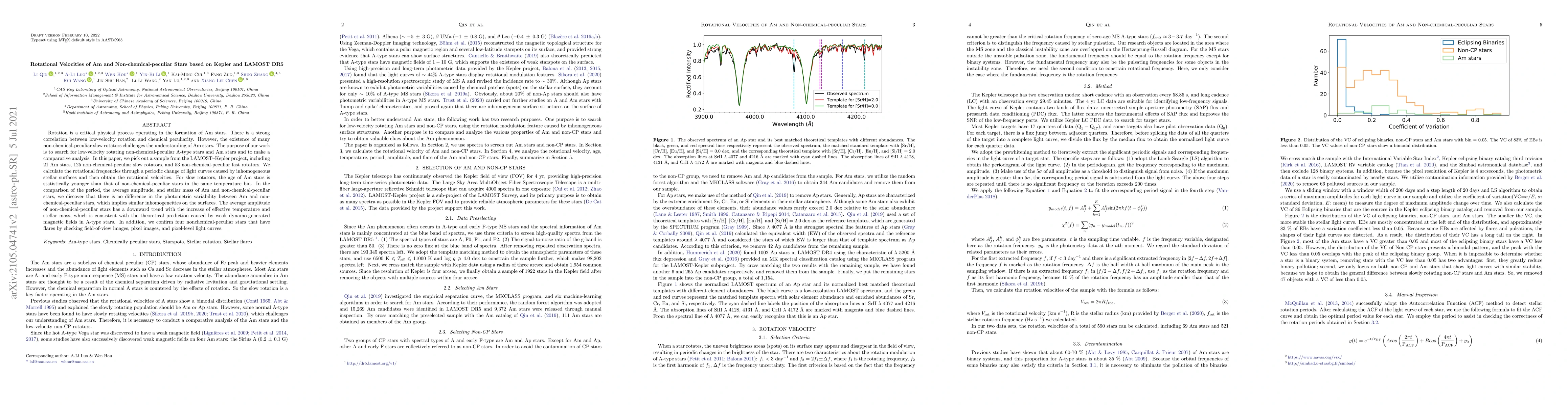 Researchers analyzed rotation velocities of Am and non-CP stars using Kepler and LAMOST data, finding no difference in photometric variability between the two types and age differences between slow rotators.