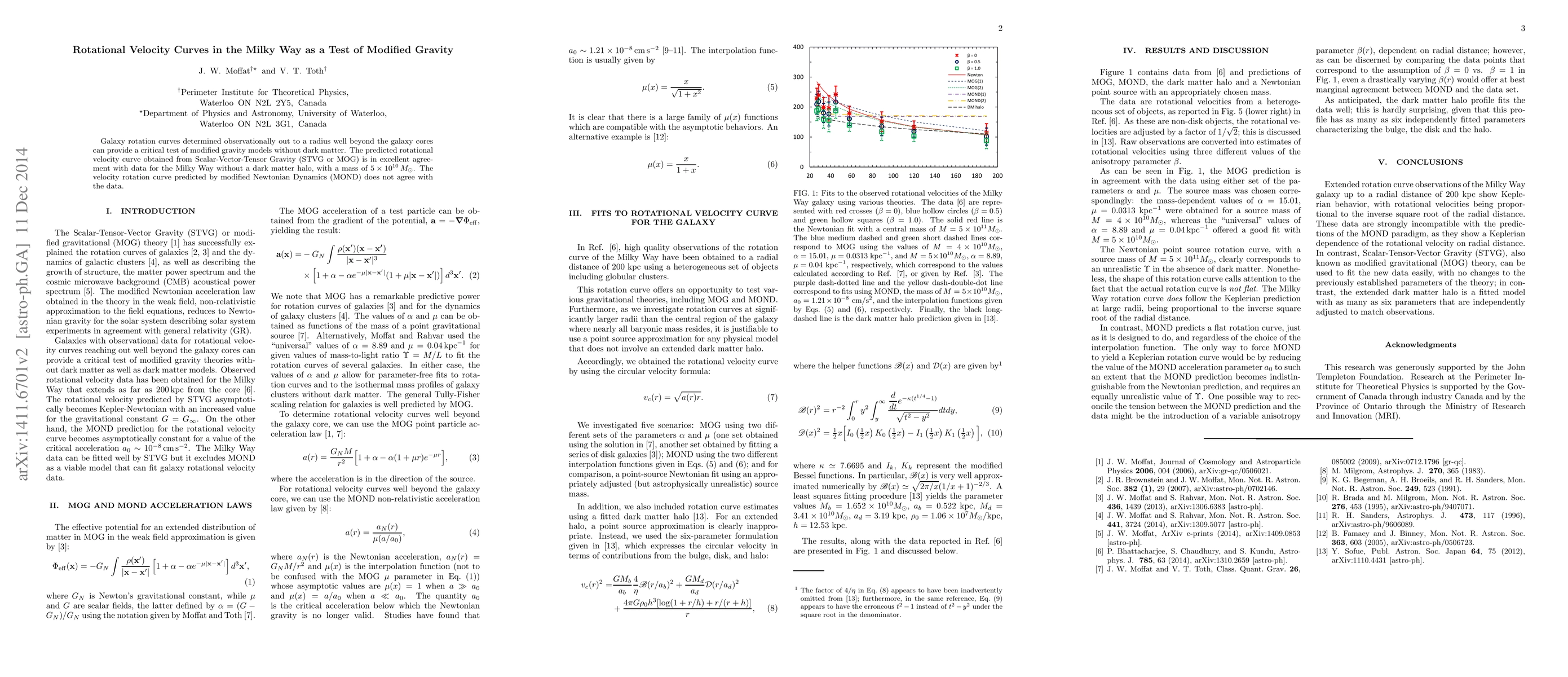 This paper tests modified gravity models against Milky Way rotational velocity curves, finding that Scalar-Vector-Tensor Gravity (STVG/MOG) aligns well with observational data without requiring a dark matter halo, while Modified Newtonian Dynamics (MOND) does not match the data.