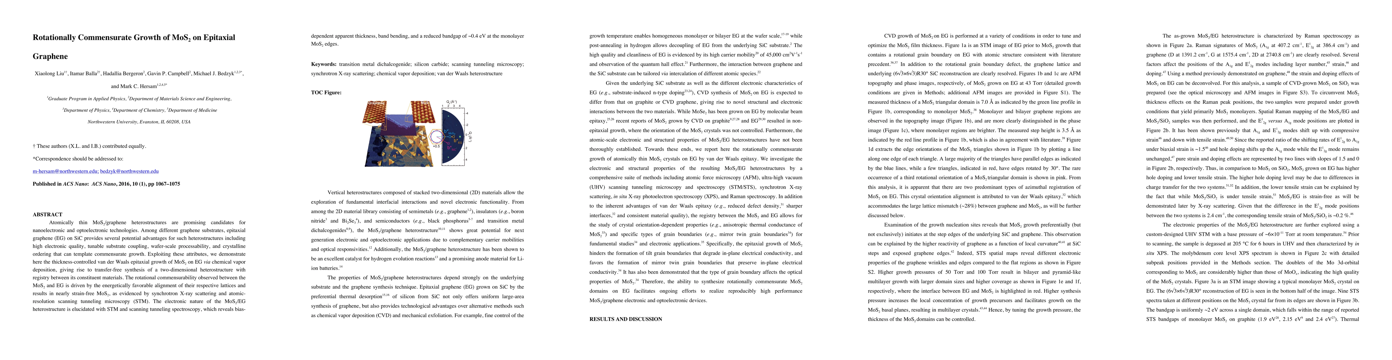 This paper demonstrates the growth of rotationally commensurate monolayer MoS2 on epitaxial graphene via chemical vapor deposition, showing nearly strain-free alignment and revealing electronic properties like band bending and a reduced bandgap using STM and scanning tunneling spectroscopy.
