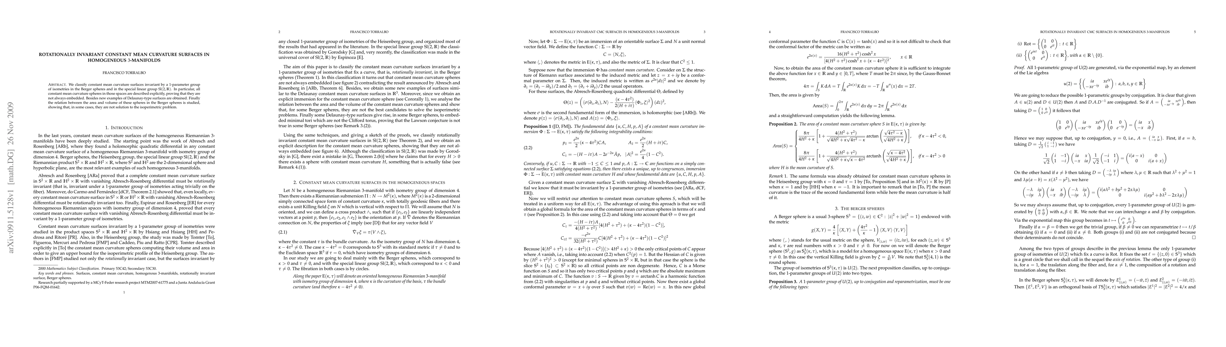 This paper classifies constant mean curvature surfaces invariant under a 1-parameter group of isometries in the Berger spheres and Sl(2, R), providing explicit descriptions and showing they are not always embedded. It also explores the relationship between area and volume, revealing they do not always solve the isoperimetric problem.
