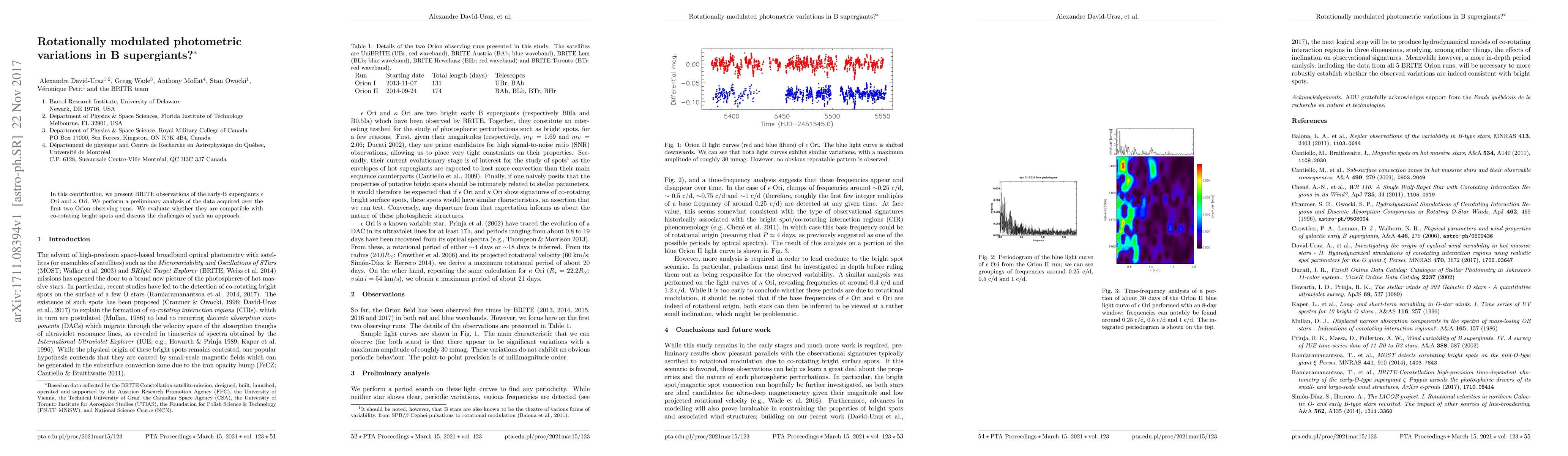 In this contribution, we present BRITE observations of the early-B supergiants $\epsilon$ Ori and $\kappa$ Ori. We perform a preliminary analysis of the data acquired over the first two Orion observing runs. We evaluate whether they are compatible with co-rotating bright spots and discuss the challenges of such an approach.