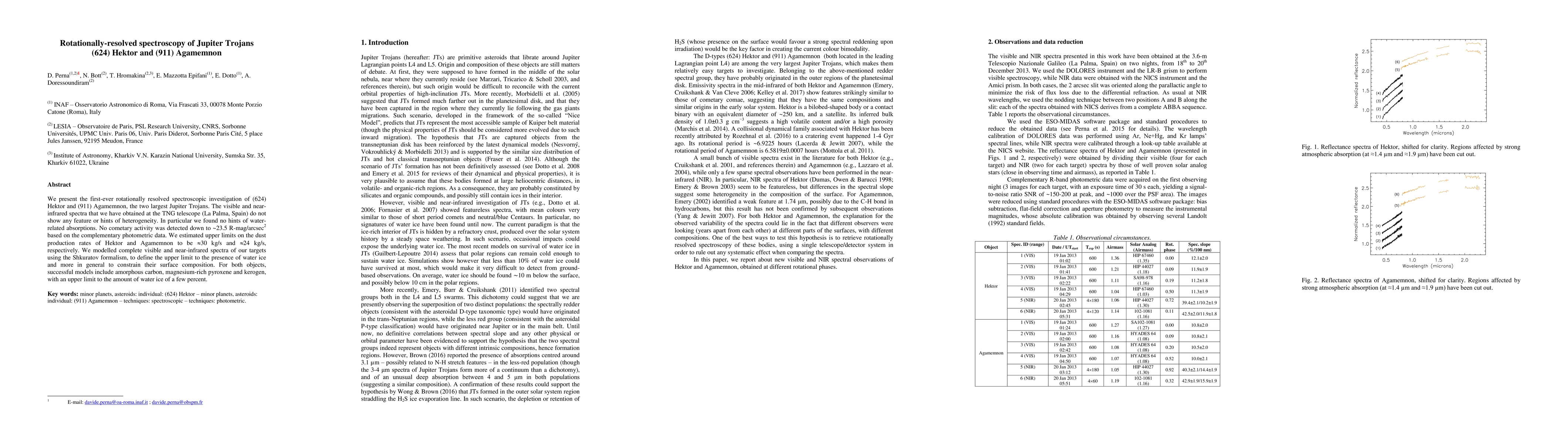 This study presents the first rotationally resolved spectroscopy of Jupiter Trojans (624) Hektor and (911) Agamemnon, revealing no heterogeneity or water-related absorptions in their spectra. No cometary activity was detected, and upper limits for dust production rates were estimated.