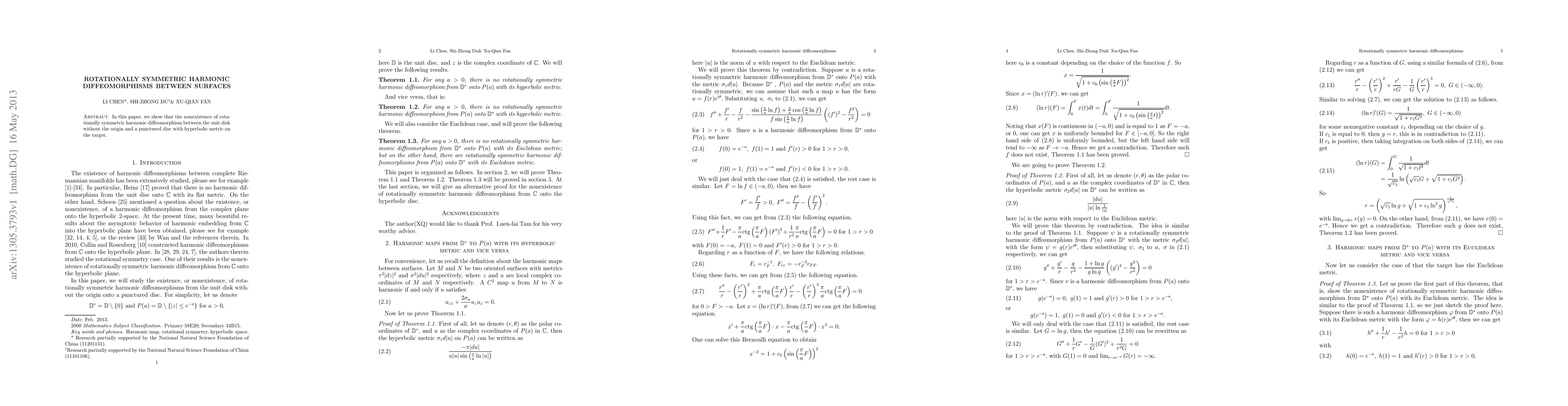 Summary: This paper demonstrates that no rotationally symmetric harmonic diffeomorphism exists between the unit disk excluding the origin and a punctured disc with a hyperbolic metric on the target. The findings highlight the unique topological and metric constraints involved.