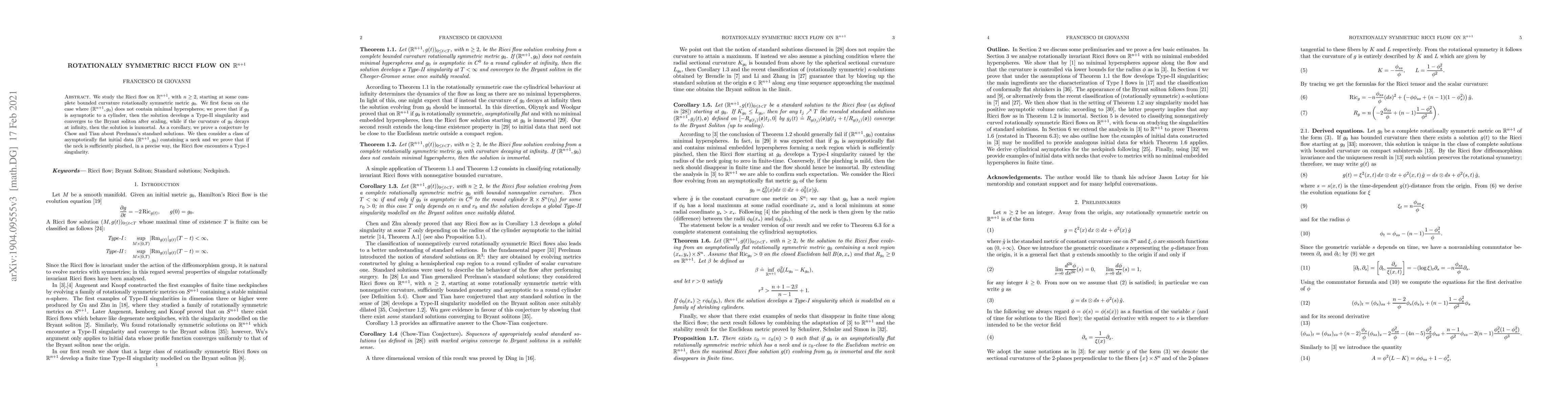 Researchers studied the Ricci flow on $ar{R}^{n+1}$ with specific rotationally symmetric initial metrics, finding that under certain conditions, it can lead to singularities or converge to a known soliton, shedding light on Perelman's standard solutions and the behavior of asymptotically flat data.