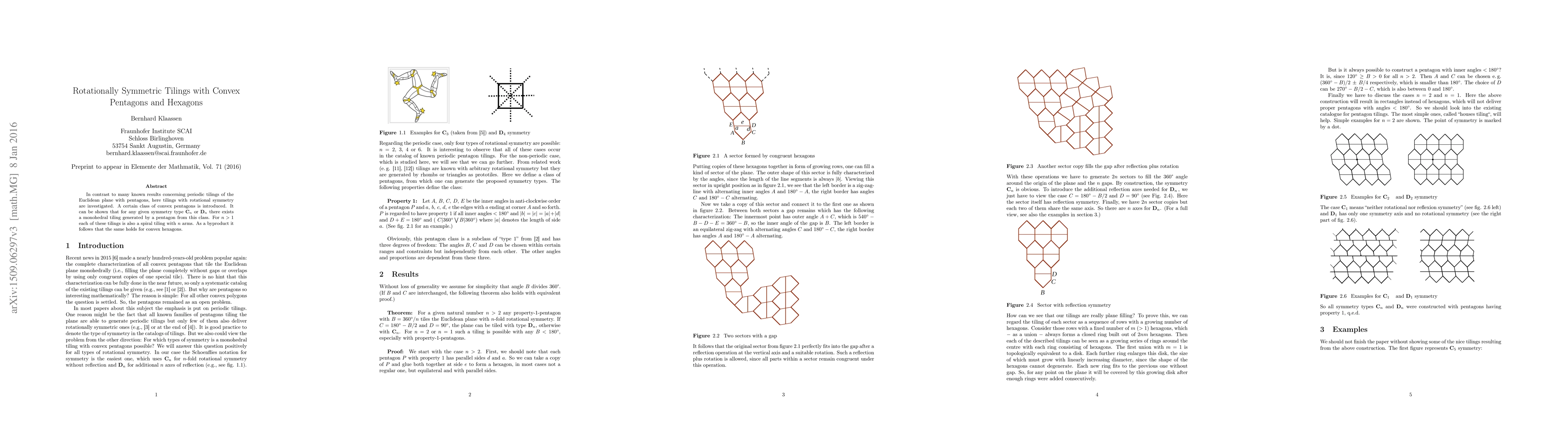 This paper explores rotationally symmetric tilings of the plane using convex pentagons and hexagons, proving the existence of monohedral tilings for each symmetry type $\mathbf{C}_{n}$ or $\mathbf{D}_{n}$, and extending the result to convex hexagons. The pentagon tilings are also shown to form spiral patterns with $n$ arms for $n>1$.