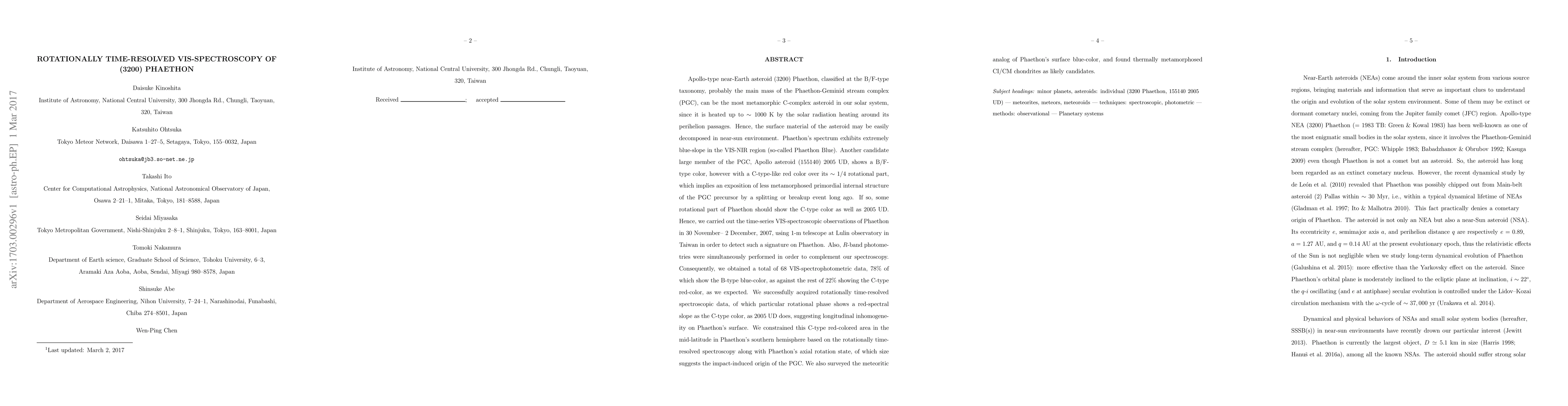 Apollo-type NEA (3200) Phaethon, classified at the B/F-type taxonomy, probably the main mass of the Phaethon-Geminid stream complex (PGC), can be the most metamorphic C-complex asteroid in our solar system, since it is heated up to ~1000 K by the solar radiation around its perihelion passages. Hence, its surface material may be easily decomposed in near-sun environment. Phaethon's spectrum exhibits extremely blue-slope in the VIS-NIR region (so-called Phaethon Blue). Another candidate large member of the PGC, (155140) 2005 UD, shows a B/F-type color, however with a C-type-like red color over its ~1/4 rotational part, which implies an exposition of less metamorphosed primordial internal structure of the PGC precursor by a splitting or breakup event long ago. If so, some rotational part of Phaethon should show the C-type color as well as 2005 UD. Hence, we carried out the time-series VIS-spectroscopic observations of Phaethon using 1-m telescope in order to detect such a signature. Also, R-band photometries were simultaneously performed in order to complement our spectroscopy. Consequently, we obtained a total of 68 VIS-spectrophotometric data, 78% of which show the B-type blue-color, as against the rest of 22% showing the C-type red-color. We successfully acquired rotationally time-resolved spectroscopic data, of which particular rotational phase shows a red-spectral slope as the C-type color, as 2005 UD does, suggesting longitudinal inhomogeneity on Phaethon's surface. We constrained this C-type red-colored area in the mid-latitude in Phaethon's southern hemisphere based on the rotationally time-resolved spectroscopy along with Phaethon's axial rotation state, of which size suggests the impact-induced origin of the PGC. We also surveyed the meteoritic analog of Phaethon's surface blue-color, and found thermally metamorphosed CI/CM chondrites as likely candidates.